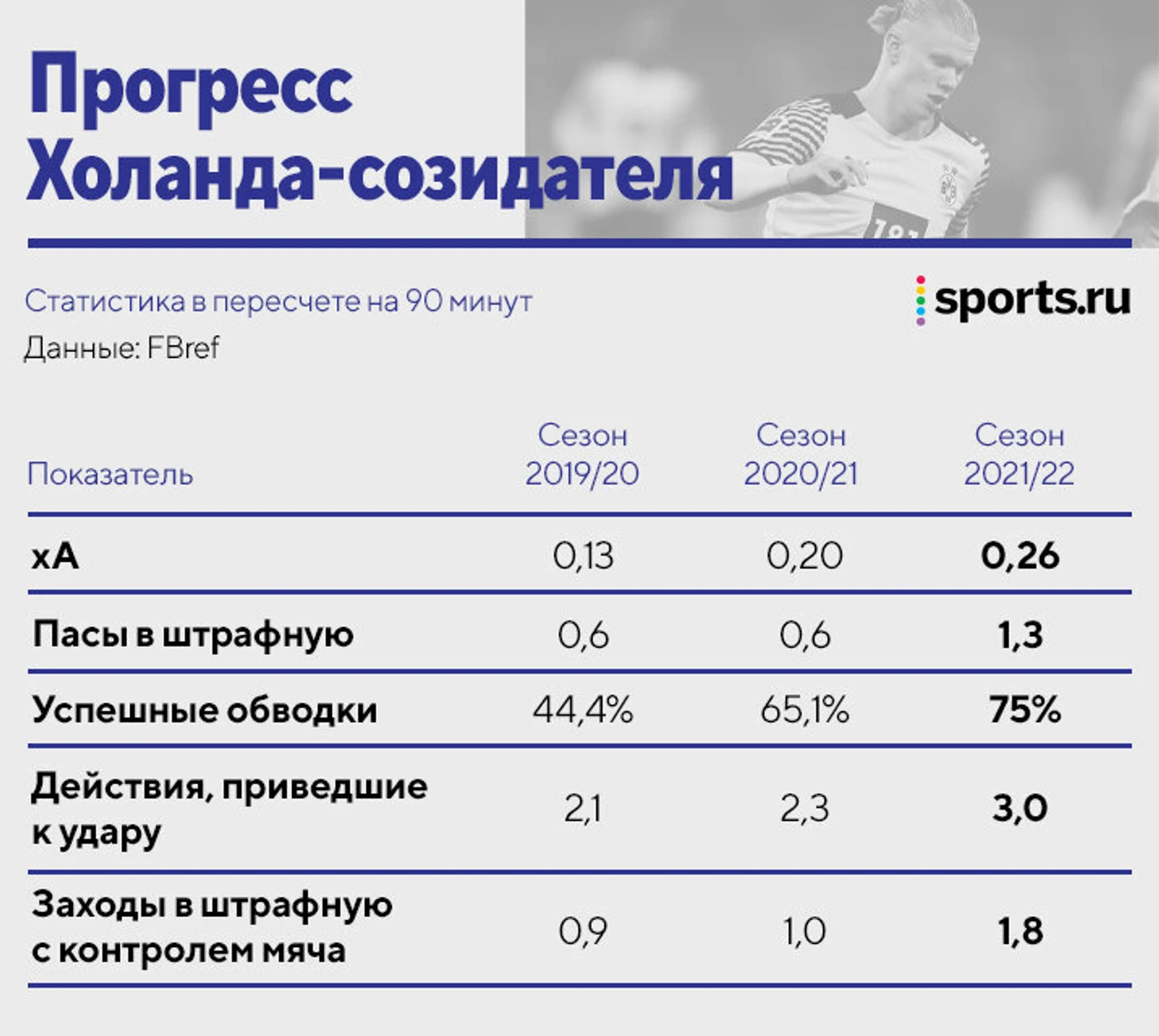 В этом сезоне Холанд улучшил все важные созидательные метрики: xA, пасы в штрафную, успешность дриблинга, число действий, приводящих к удару, количество заходов в штрафную с контролем мяча.