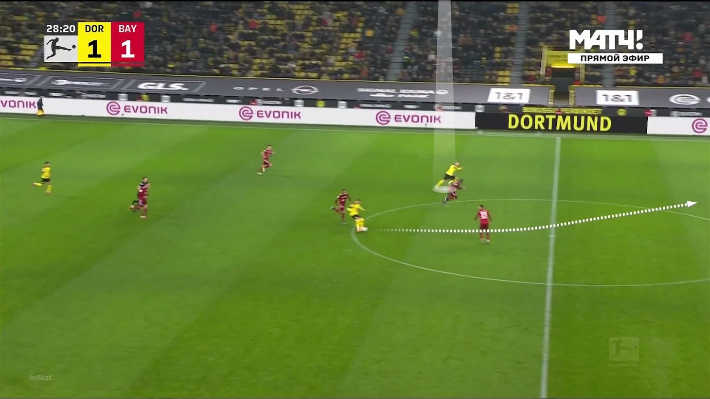 Еще Холанд приносит пользу движением без мяча – разберем на примере из матча с «Баварией». Эрлинг сохранил атакующую компактность, оставшись рядом со скоплением на левом фланге. Ускорился под пас ближе к флангу, открывая центральный коридор для Юлиана Брандта. Люка Эрнандес сначала остановился, пытаясь сделать искусственный офсайд, и только затем среагировал на заброс за спину.