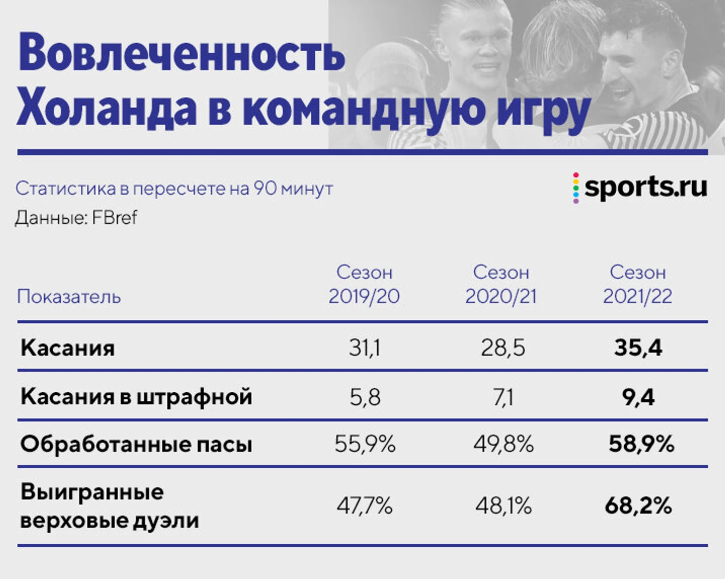 Теперь Холанд чаще касается мяча (в штрафной рост крайне серьезный), обрабатывает больше адресных передач (58,9%) и выигрывает много верховых дуэлей (68,2%).