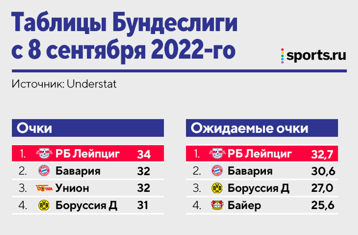 Никаких манипуляций: с 8 сентября 2022-го, когда Розе официально объявили тренером, прошло 16 туров Бундеслиги. По их итогам «Лейпциг» одновременно лидирует и по фактическим очкам, и по ожидаемым (xPoints рассчитываются на основе разницы между ожидаемыми голами xG и ожидаемыми пропущенными xGA).