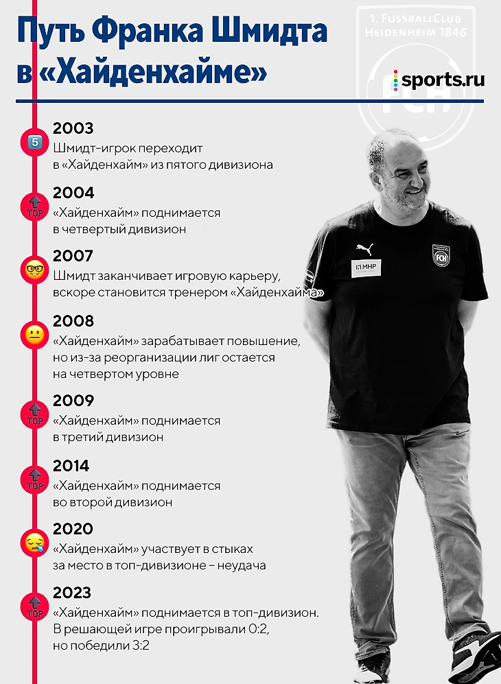 В 2017-м, когда Шмидт праздновал юбилейные 10 лет в клубе, он дал интервью авторитетному немецкому изданию Der Spiegel. Финальный вопрос беседы: «Кого мы увидим в Бундеслиге раньше: вас или «Хайденхайм»?»