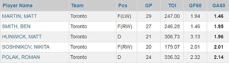 4) Второе место в Торонто по Goals Against/60 - сколько в среднем пропускает команда за 60 минут нахождения этого игрока на площадке. Лучше - только у партнера Смита по звену Мэтта Мартина.