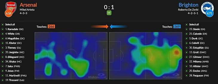 В этом матче проблема пошла еще дальше. За весь первый тайм канониры сделали 144 паса с точностью менее 70%. У «Брайтона» — 247 пасов и 80+% точности. Если контроль не создает преимущества сам по себе, то количество брака в передачах часто перерастает в огромные проблемы. Они не заставили себя ждать во втором тайме.