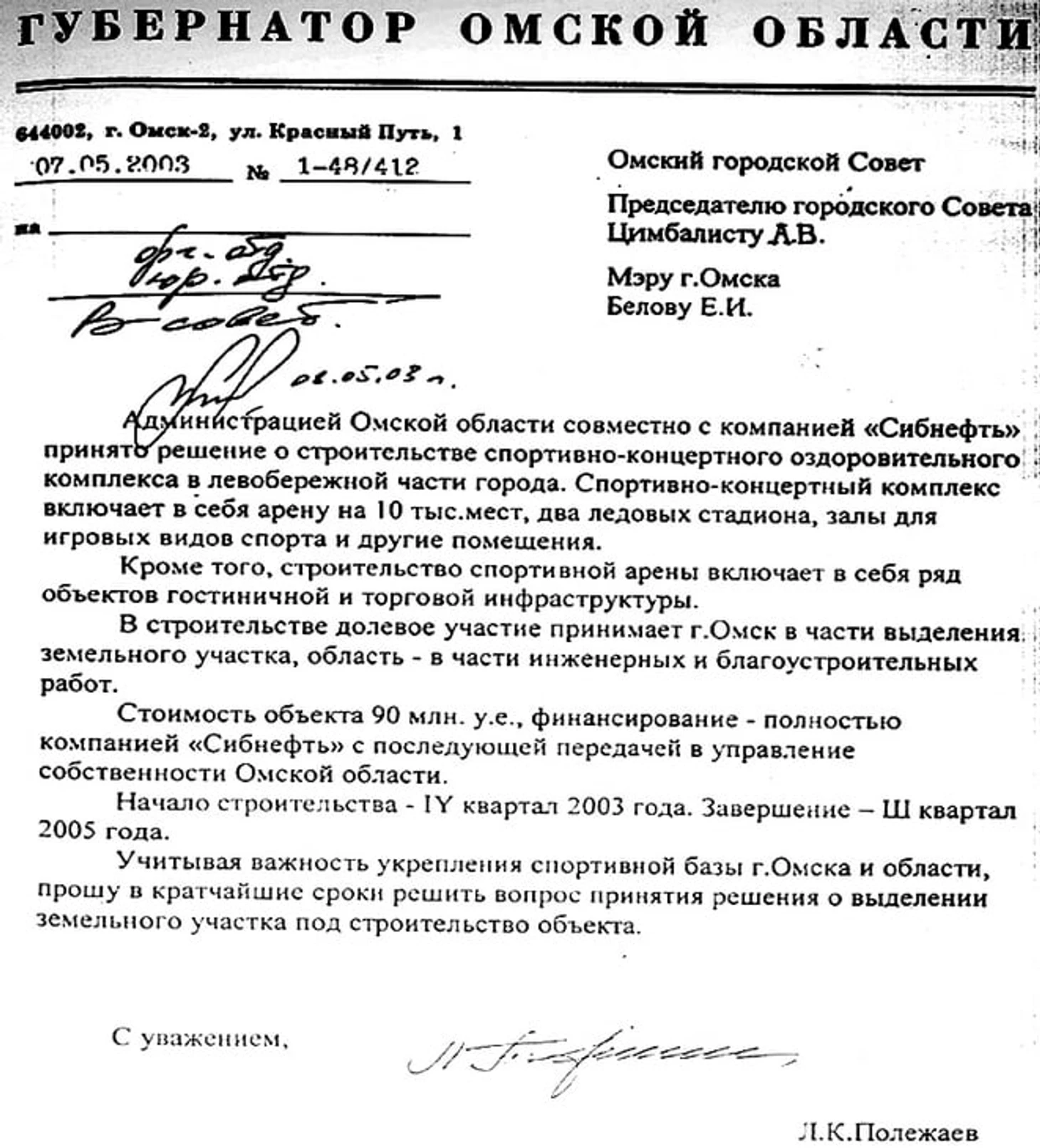Этот документ от 7 мая 2003 года – от губернатора области к Омскому городскому совету – доказывает два момента.