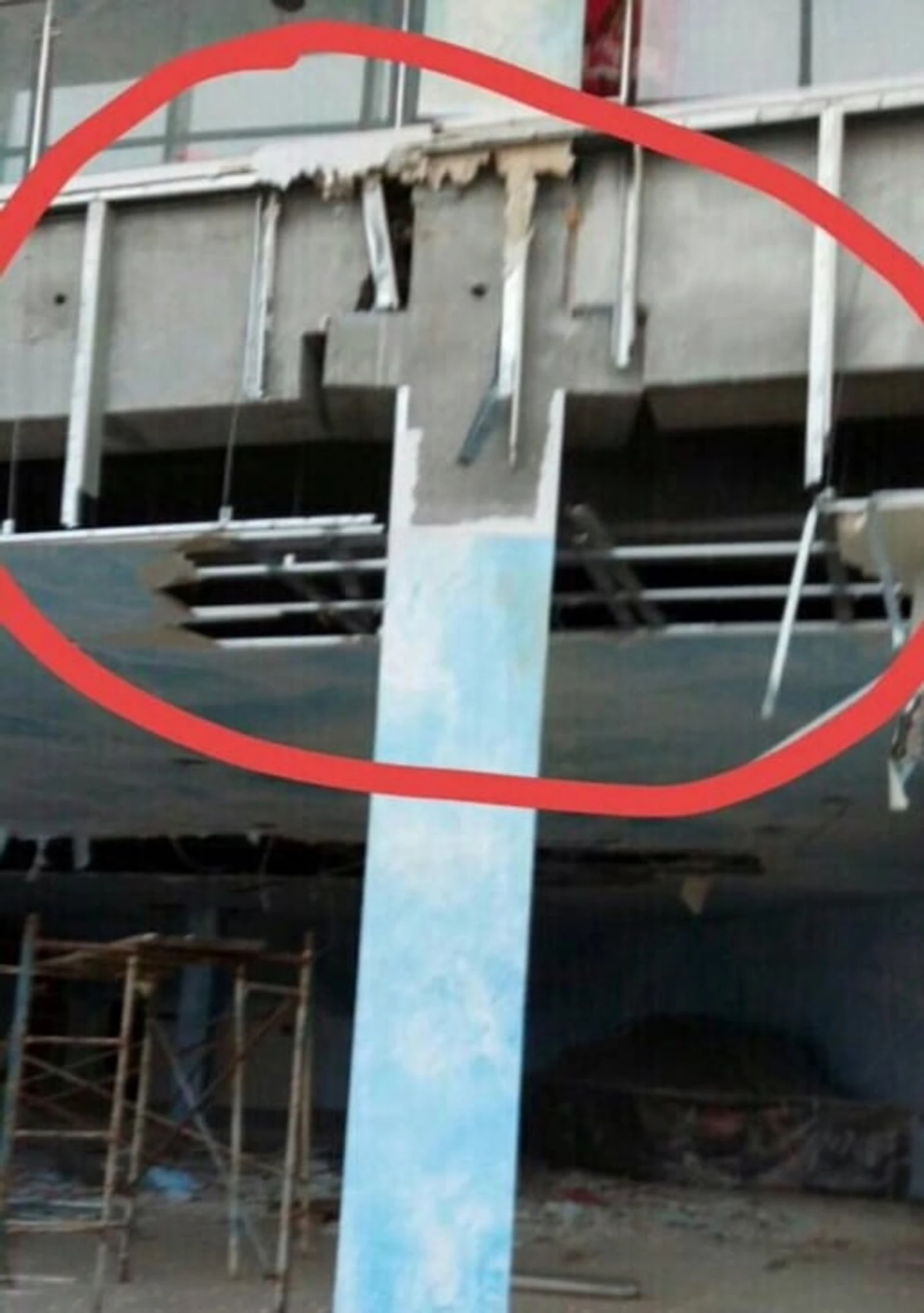 Обратите внимание на это же фото выше – несущие конструкции «Арены» выглядят довольно хлипко. Опоры, поперечные балки, плиты – все на первый взгляд какое-то тонкое. Кстати, именно эти опоры и подверглись видимому кручению.
