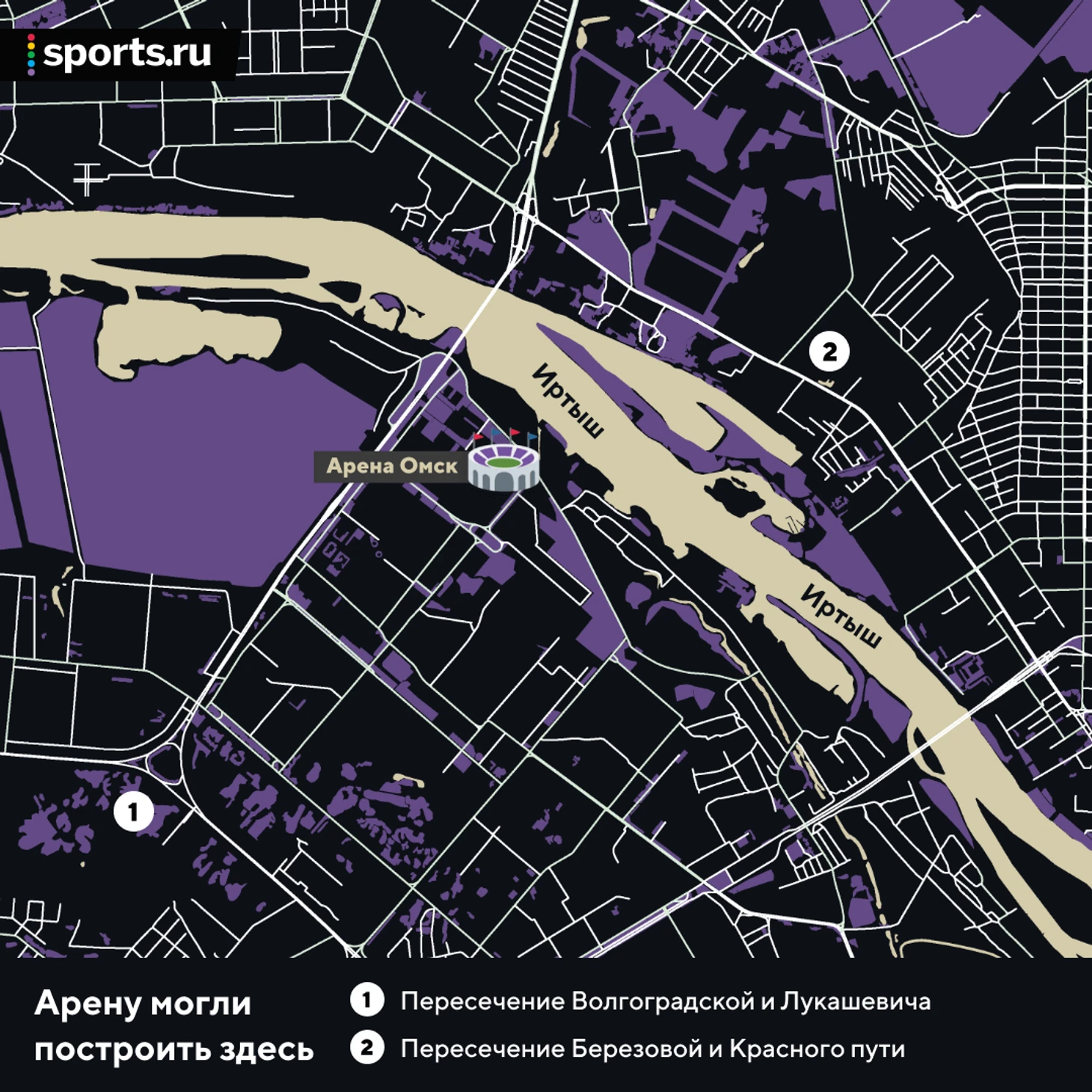 «Из 10 площадок, которые были предложены управлением архитектуры Омска, мы остановились на трех наиболее подходящих. Первая площадка (на карте ниже – «Арена-Омск» – Sports.ru), которая находится около моста им. 60-летия ВЛКСМ, вторая площадка – на пересечении улиц Волгоградской и Лукашевича и третья – пересечение улицы Березовой и Красного пути. Площадка около моста им. 60-летия ВЛКСМ наилучшим образом подходит для строительства комплекса, так как она расположена вблизи городка Нефтяников, где живет большое количество студентов, имеет хорошую площадь, транспортную доступность и обзорность».