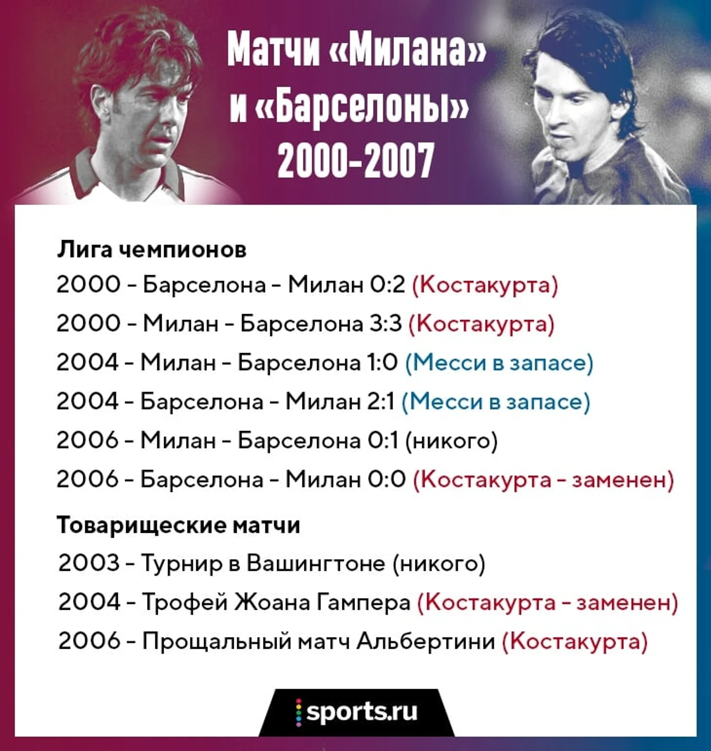 Мы попытались найти тот матч, когда Месси якобы повозил Костакурту – интересно же, как почти 40-летний защитник играл против 16-летнего аргентинца. Изучили все игры «Милана» и «Барселоны» в 2000-е – даже товарищеские. Ни в одной Месси и Костакурта не пересекались хотя бы в запасе.