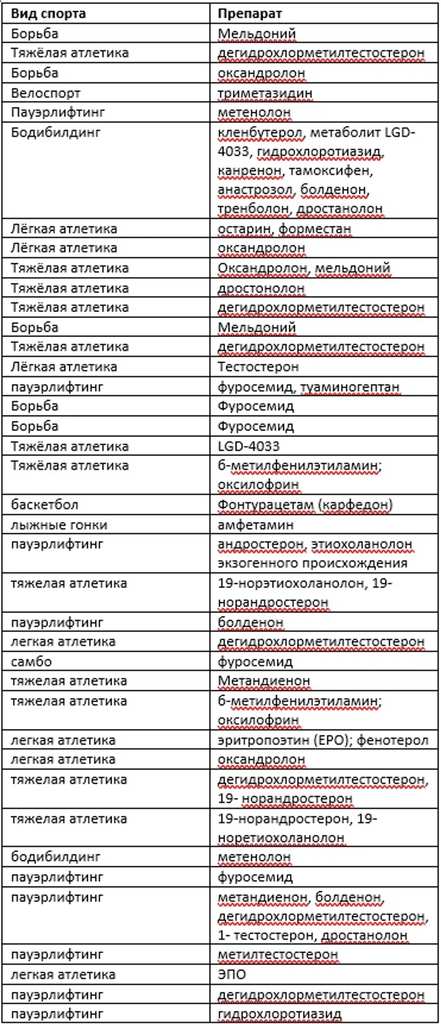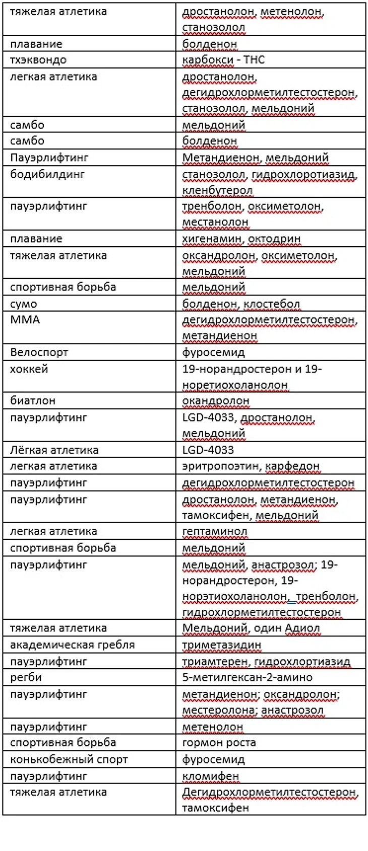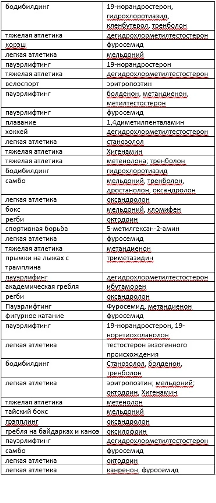 Для этого данные все трёх стран были объединены в общую таблицу, а далее, уже без какой-либо привязки к видам спорта, были выделены основные вещества из списка и приведено их влияние на организм спортсмена в качестве справочной информации.