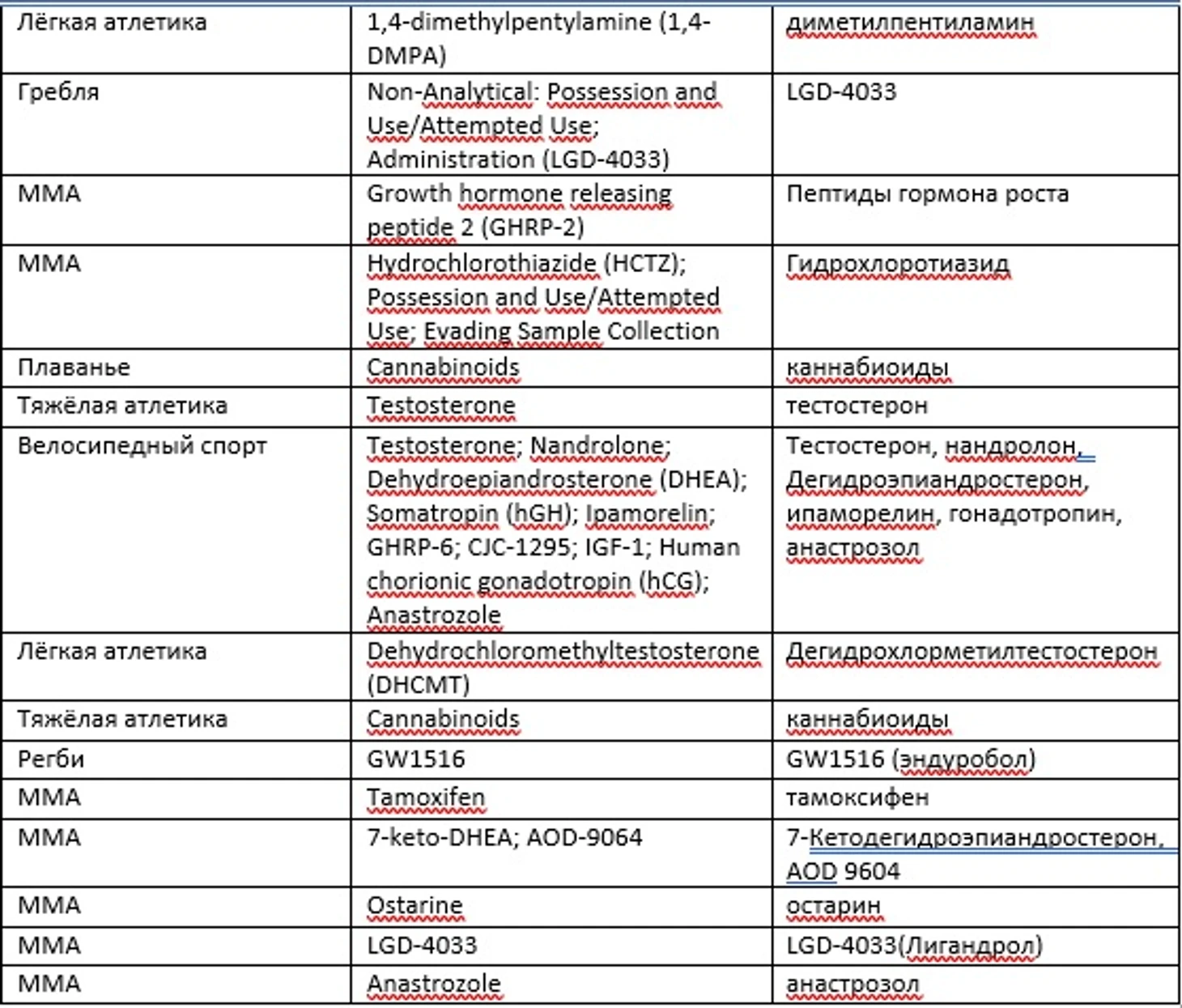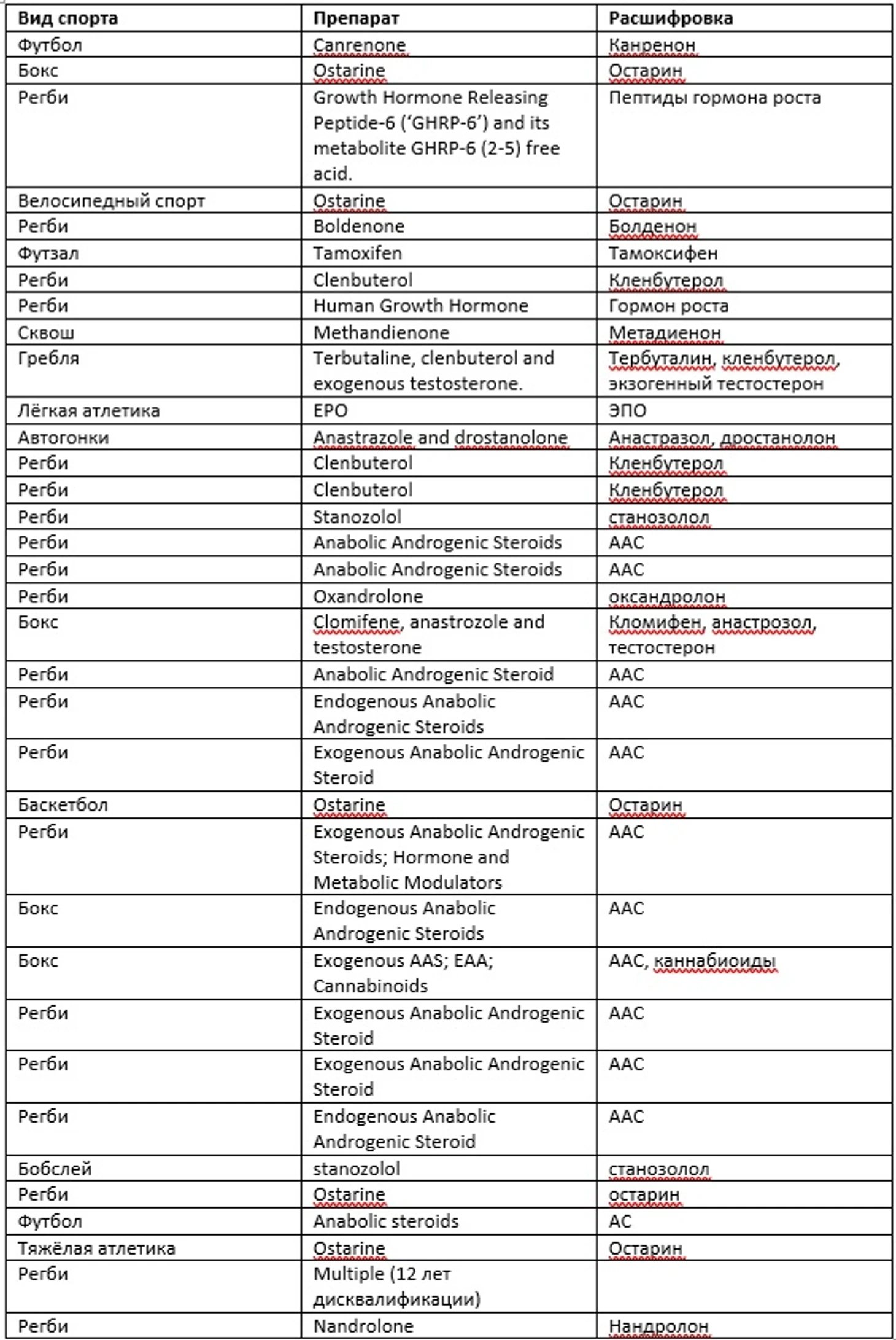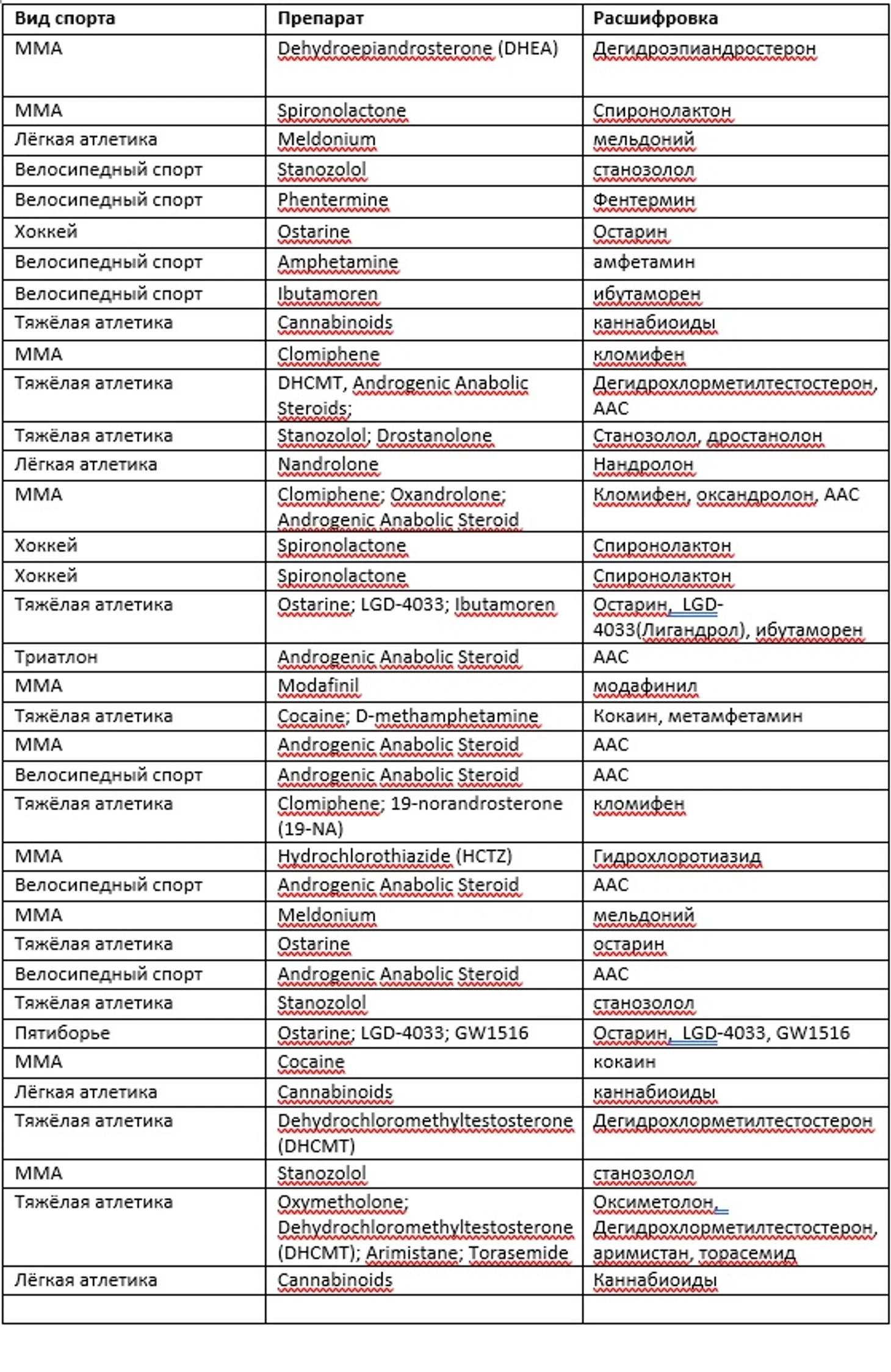 Для этого данные все трёх стран были объединены в общую таблицу, а далее, уже без какой-либо привязки к видам спорта, были выделены основные вещества из списка и приведено их влияние на организм спортсмена в качестве справочной информации.