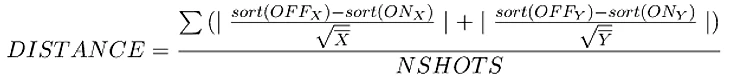 Дальше мы разбиваем броски на две выборки: с партнером на площадке и без, большую из них обрезаем до размера меньшей (т.е. если у игрока 350 бросков без партнера и 250 с партнером, то дальше участвуют 250 бросков из каждой) и считаем дистанцию между этими группами. Считается она так: