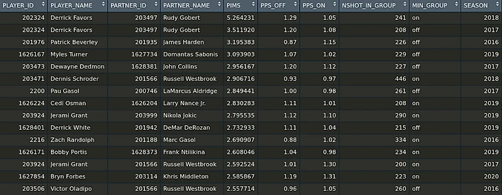 Итак, задача уже была озвучена, теперь о ее решении. Во время любого броска на площадке помимо бросающего есть еще 4 партнера. Данных о том, кто в данный момент находится на площадке НБА не дает, но их в 99% случаев можно получить из play-by-play, а оставшийся процент из боксскора. Как это сделать интересная задача, но описание ее решения не для этой статьи (скажу только, что я не ожидал, что можно провести на площадке всю четверть без замен, не сделав ничего, чтобы попало в протокол. Но Гаррет Темпл в Сакраменто однажды такое провернул). В итоге у нас для каждой пары игрок-партнер есть следующие данные: