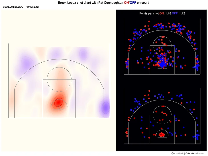 Ну а в конце я вставлю таблицу топ-15 показателей PIMS за 5 сезонов, отфильтрованную от Краудеров и еще несколько графиков, которые мне кажутся интересными. Стоит заметить, что пара Лопес-Коннатон должна подходить под категорию отфильтрованных (вряд ли именно Пэт влияет на бросок Брука), но я оставил их график как демонстрацию разницы в использовании Лопеса между первым и вторым юнитом Милуоки.