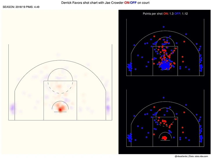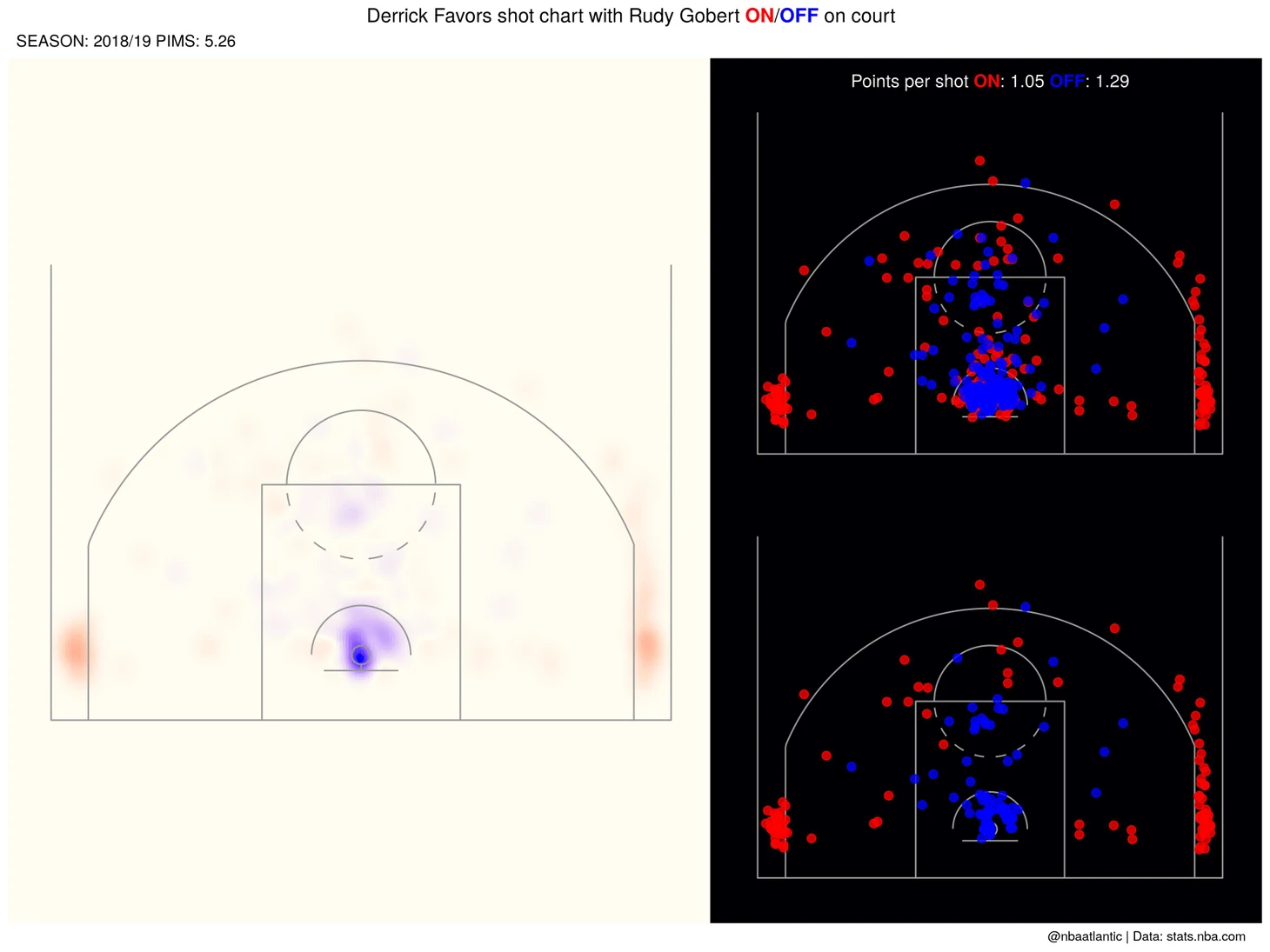 Так получилось из-за того, что друг без друга эти игроки играли в своей любимой зоне «поближе к кольцу», но когда они появлялись на паркете вместе, краска не могла выдержать двоих и один из них (Гобер) продолжал играть вблизи кольца, а другой (Фэйворс) вынужден был уходить в поле и играть по схеме «принеси-подай-иди в угол, не мешай». У Руди, кстати, shot-selection от наличия на площадке Фэйворса не зависел никак. На пятом (на втором если отбросить «пассажиров») месте Фэйворс-Гобер из сезона-2017/18. Как видно по PPS, Деррик при игре вдвоем сильно проседал по эффективности броска, так что нет ничего удивительного в том, что в итоге его пути с Ютой разошлись.