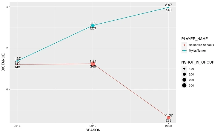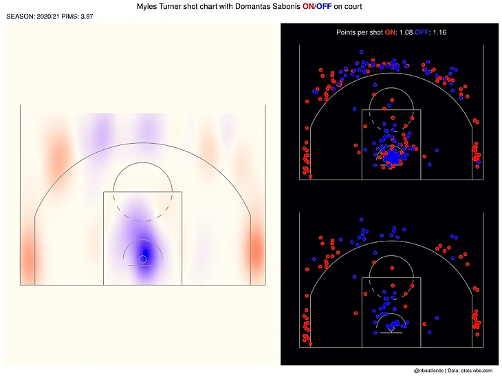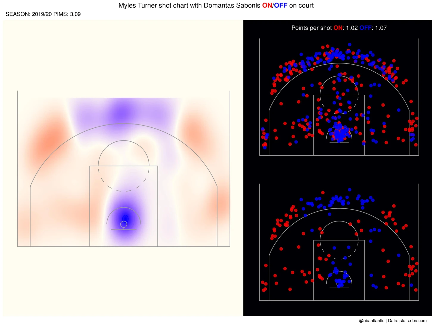 На графике видно развитие событий: примерно одинаковый PIMS в первом сезоне, резкий рост PIMS Тернера во втором, продолжение этого роста в третьем (в финальную таблицу этот результат не попал, т.к. я туда включал только группы с 200+ бросками) и одновременное падение влияния Тернера на бросок Сабо. Когда Майлз на площадке один, он бросает по кольцу из центральной зоны, ограниченной боковыми линиями краски. Когда же они играют вместе, Тернер уходит из центральной зоны на края, в то время как Сабонис бросает оттуда же, откуда и без партнера на площадке.
