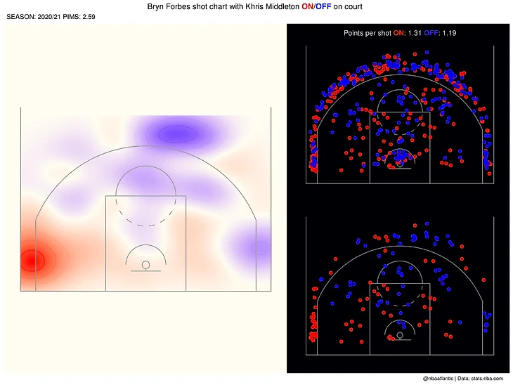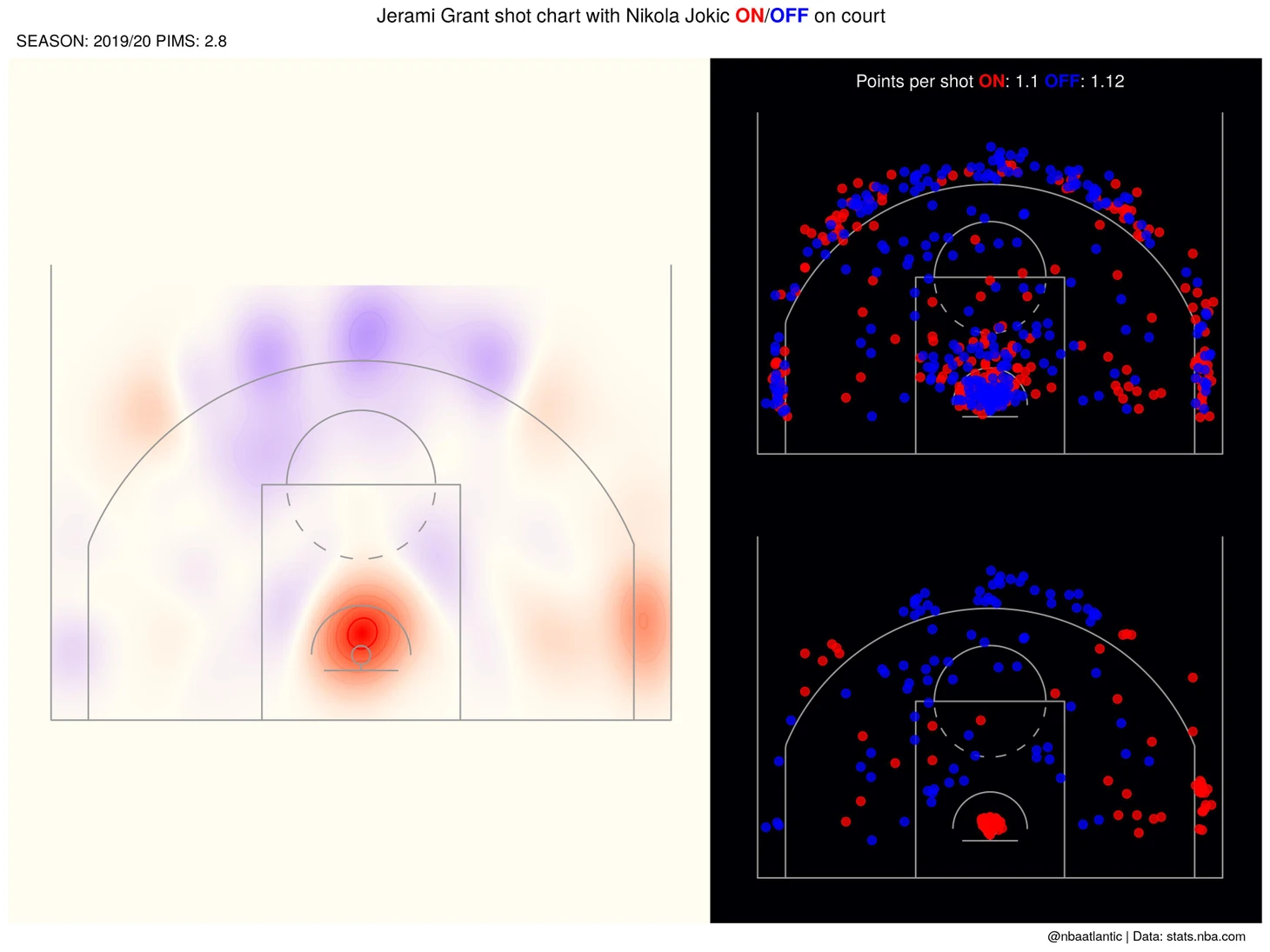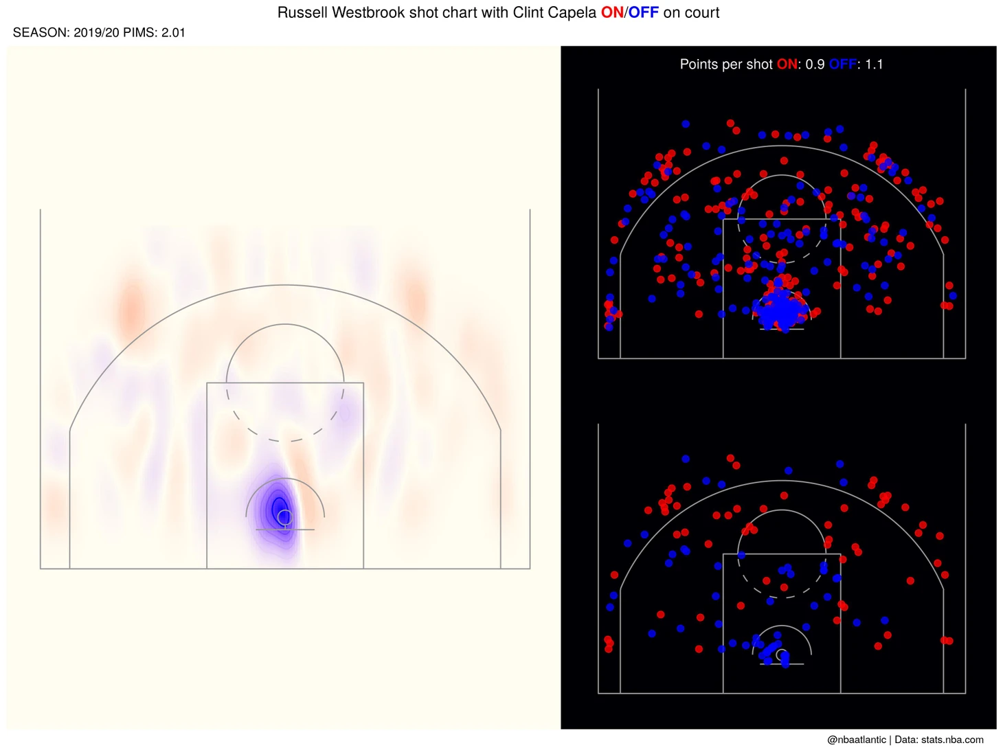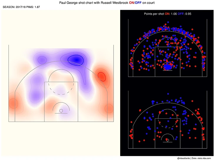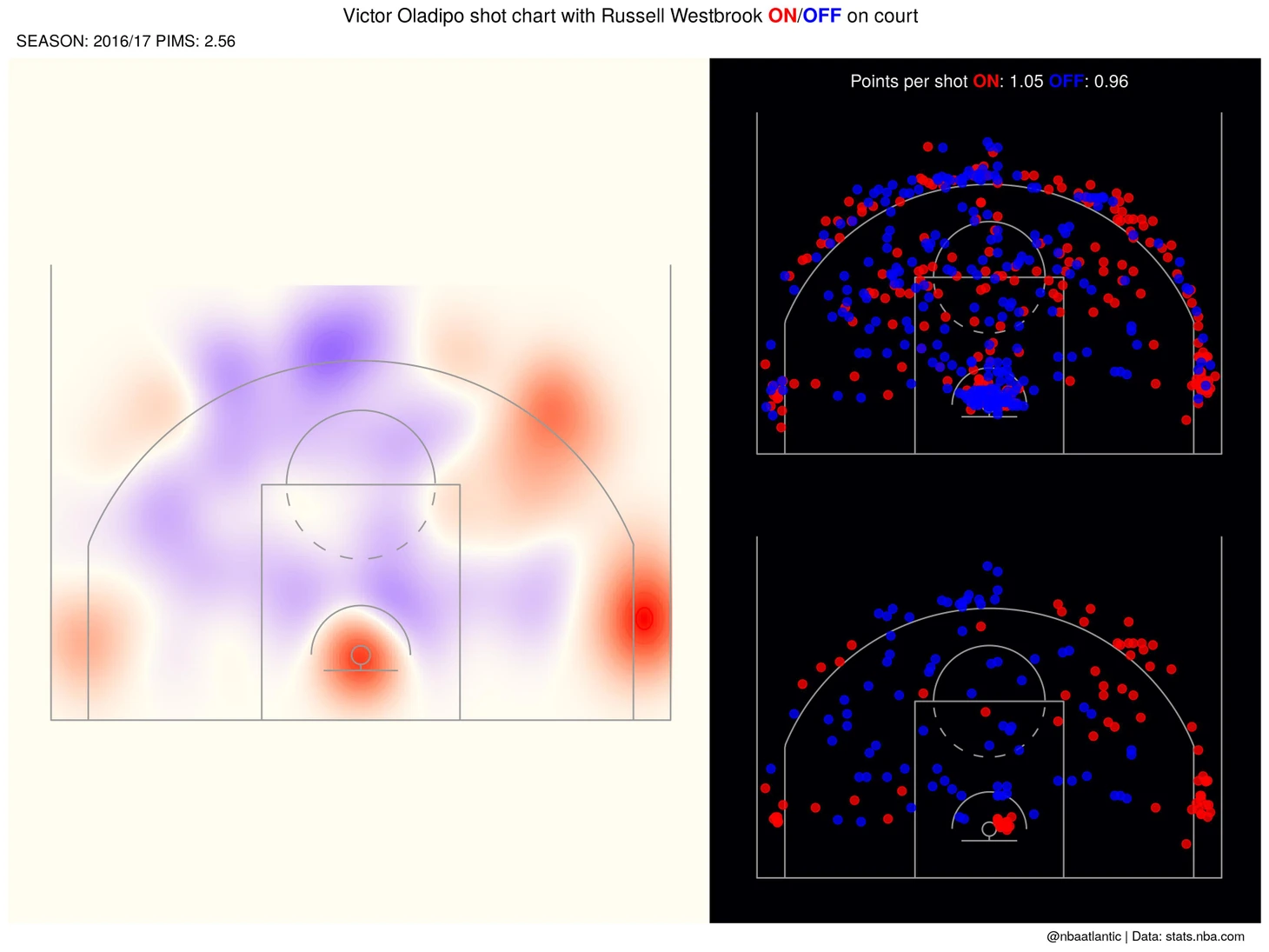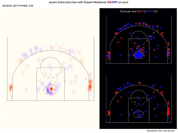 Денниса Расс выгонял на трехочковую линию, а когда того не было на площадке, Шредер сам исполнял Уэстбрука, примерно той же эффективностью (посмотрите на PPS). Оладипо с Расселом тоже больше атаковал из-за дуги, а без него переходил на средние. Грант, как и Фэйворс, освобождал краску, уходя на дугу в углы, но делал это гораздо полезнее (1.3 PPS).