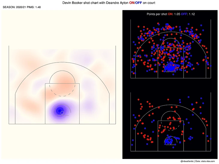 Как читать графики: график слева – это карта плотности бросков. Чем ярче красный цвет, тем больше бросков из этой зоны сделал игрок, когда партнер был на площадке, чем ярче синий, тем больше бросков, когда партнера не было. Верхний график справа: обычный точечный график бросков, с указанием очков за бросок (Points per shot). Нижний правый график: точечный график бросков, с которого удалены «близкие броски»(броски из разных групп, но с примерно одинаковыми координатами). Это позволяет четче видеть кластеры.