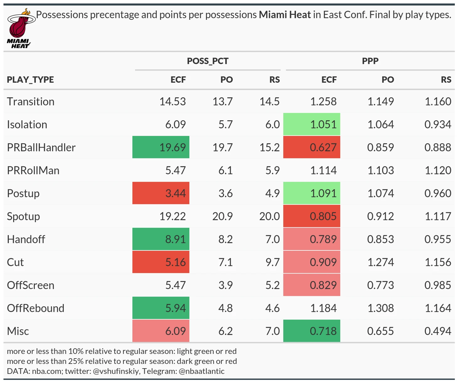 Если не смотреть игры, а только цифры, удивительно как Майами не влетели 0-4 с -20 в каждой игре. В первых двух играх основным розыгрышем Хит были PRBallHandler, хотя в регулярке его играли только в 15% владений. Резкое падение в 3 и 4 игре связаны со здоровьем основных игроков для этого розыгрыша: Батлера (13 владений в первых двух играх) и Хирро (18). Это что касается количества. Что касается качества пик-н-роллов, то достаточно посмотреть на количество красного в строке. Они не работали, давая Хит жалкие 0.6 очка за владение. Также не пошло дело и у шутеров флоридцев: спот-апы и оффскрины 0.8 PPP. Тоже самое и каты. Больше Хит в регулярном сезоне их делал только Голден Стейт. В финале же и доля упала почти в два раза, и продуктивность (0.9 РРР для этого типа розыгрыша это очень мало). На уровне были изоляции и PRRollMan, чуть лучше среднего Майами сыграли в транзишн. На путбэках у Майами вполне нормальные цифры, но добыты они одним Адебайо, у которого на 14 владений 1.6 PPP.