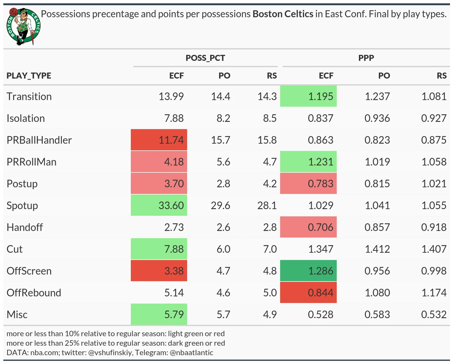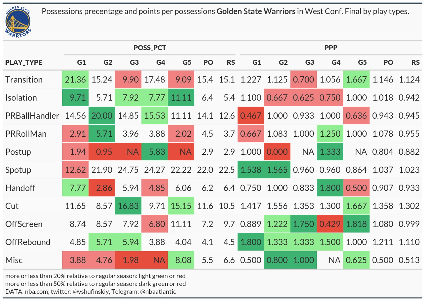 К моменту публикации этого поста уже написана тонна статей о финалах, и еще столько же будет написано до 2 июня. Я тоже проанализирую финалы, но, как и всегда в этом блоге, с точки зрения цифр. Статьи на тему «Карри вернулся?», «Уиггинс красавчик или нет?», «Сколько игр еще сам себе проиграет Бостон?» напишут и без меня, да и что скрывать, гораздо лучше меня. Я же в этой статье постараюсь посмотреть на каждую игру и серии в целом через пару показателей типов владений: их процент от общего числа (POSS_PCT) и очки за владение (Points per possession, PPP). Следующие пара пунктов с вводной информацией, после чего и начнем.