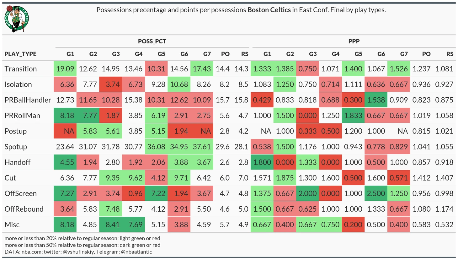 У Бостона, как и у Далласа, больше трети владений – спот-апы. Правда с посредственным качеством (как и по всему сезону в целом). Причем их доля росла в течение серии: всего 23,5% в первой игре, примерно 31% в 2-4 играх, и 35+% в трех последних, с 37.61% в решающем матче. У Смарта и Уайта они составляли 50% розыгрышей, у Тейтума и Брауна +5% к их показателям в сезоне. А вот пик-н-роллы кельты старались не играть. Если в первых двух играх PRRollMan занял долю почти в два раза больше обычного, то в седьмой игре Бостон опустил суммарную долю двух типов до 13%. Хорошо шли каты, транзишн нападение имеет два кластера: первый включает игры 1, 2, 5 и 7, когда оно работало отлично, второй 3, 4 и 6, когда оно работало плохо. Игра один-на-один (изоляции и пост-апы) не были сильной стороной кельтов в этой серии.