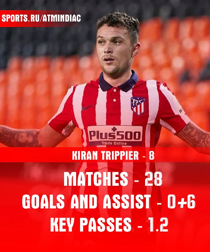 Триппьер это игрок-функция, но свою функцию он выполнял просто блестяще, а именно отличные забеги по флангу и навесы. Льоренте и Киран сыгрались еще в прошлом сезоне, когда после карантина Маркос был в блестящей форме, как и сейчас, а Триппьер наоборот сбавил, но появлялся в основе. В этом сезоне он стал одним из ключевых шестерёнок в механизме Симеоне, он был хорош как в созидании, так и в разрушении.