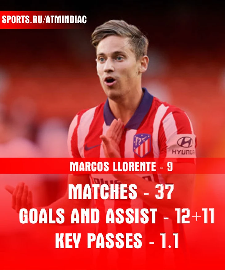 Маркос это главное открытие последних лет, как в «Атлетико», так и во всей лиге. Благодаря гибридной роли на поле и своей блестящей физике он как был ключевым игроком в атаке, так и отрабатывал в опорной зоне, большинство матчей Маркос вытаскивал в атаке буквально в одиночку. Также у него отличный дальний удар, я очень рад, что в команде наконец появился тот игрок, который не боится бить издали, такие удары очень часто спасали команду в концовках матчей. Маркос также показал, что он играет классно независимо от схемы, даже в концовке прошлого сезона, когда «Атлетико» играл 4-4-2 и по ходу этого, когда Симеоне перестраивал команду обратно на эту схему Льоренте показывал точно такую же феноменальную игру.