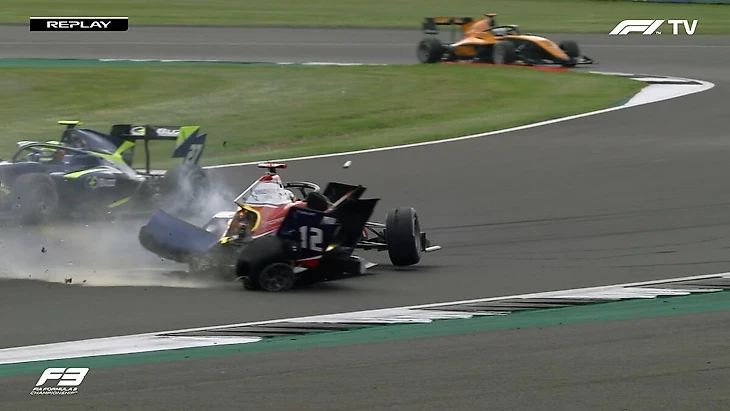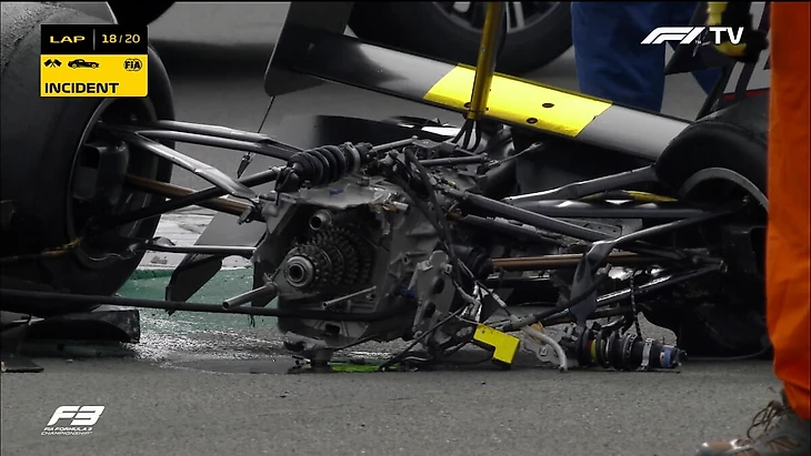 В «Формуле-3» болид разрезало надвое в мощной аварии! Задние колеса, подвеска и коробка передач повисли на маленьком кабеле