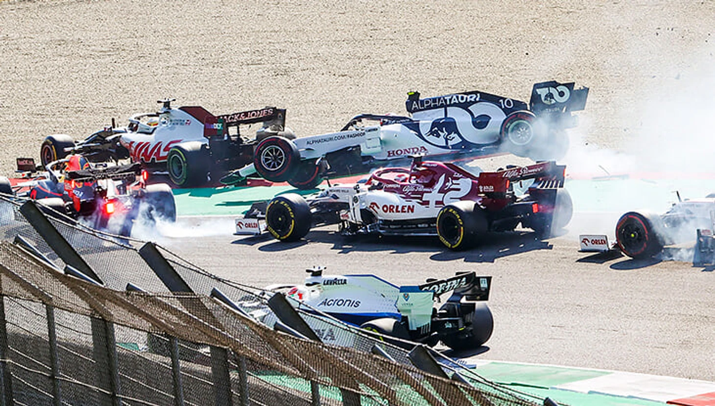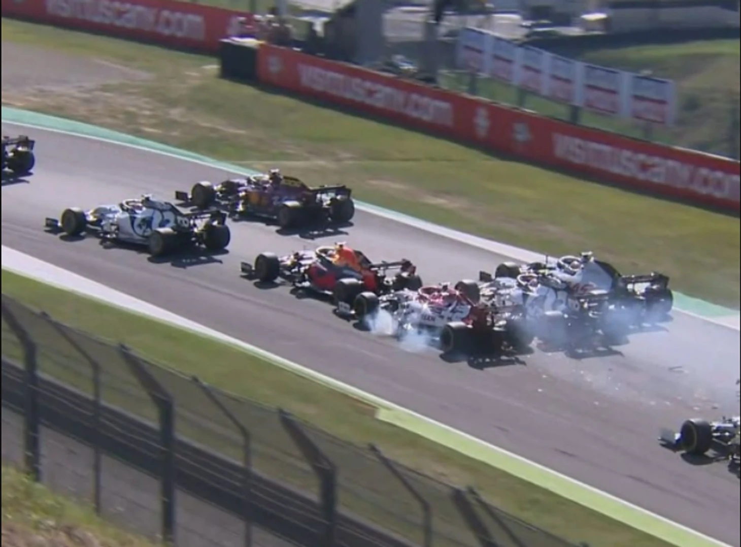 Итог: столкновение с Райкконеном, тот подпрыгнул и врезал по болиду Ферстаппена (провалившемуся из топ-3 из-за неполадок с мотором).
