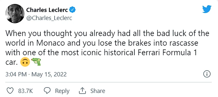 В эти выходные проклятие снова сработало. В Монако прошел исторический Гран-при (традиционное ежегодное мероприятие), Леклер прибыл туда в качестве приглашенного гостя, чтобы проехать на «Феррари» 312B3 – первом болиде Ники Лауды в Скудерии из сезона-1974. И разбил бесценную машину на третьем круге: его развернуло в повороте «Раскасс», болид врезался в барьеры задним крылом.