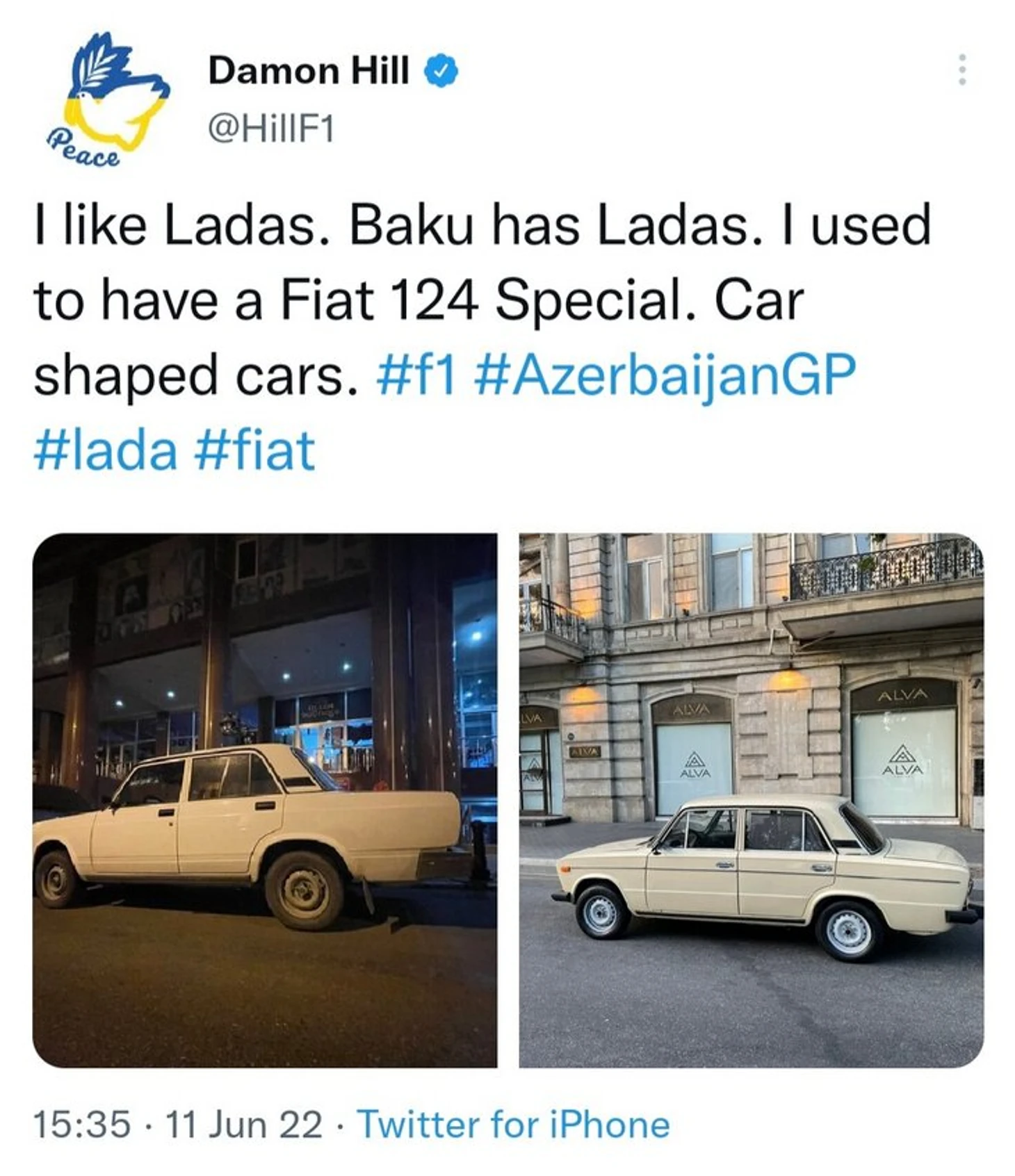В своей любви к авто признался обладатель кубка 1996-го года Дэймон Хилл. Правда с маленькой оговоркой: «Я люблю «Лады». В Баку есть «Лады». Раньше у меня был «Фиат» 124 Speciale. Машины в форме машин».