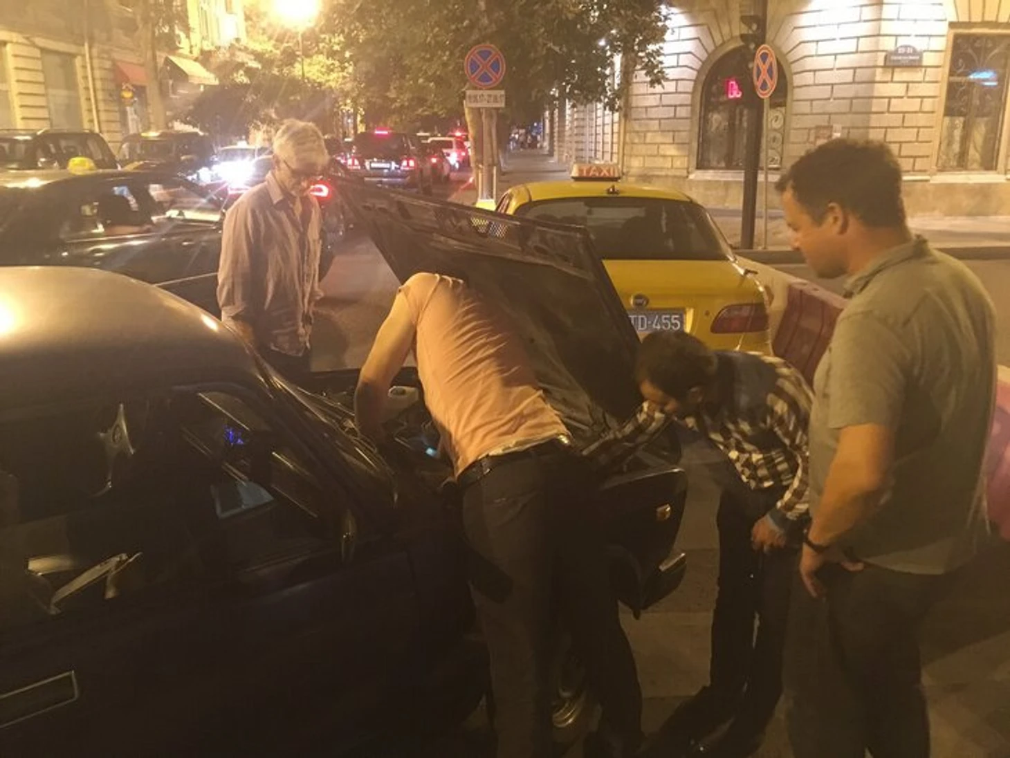 Владелец «семерки» пытался заменить выпускной коллектор на своей машине и параллельно успокоить пассажирку. Дэймон как истинный британский джентельмен предложил свои услуги.