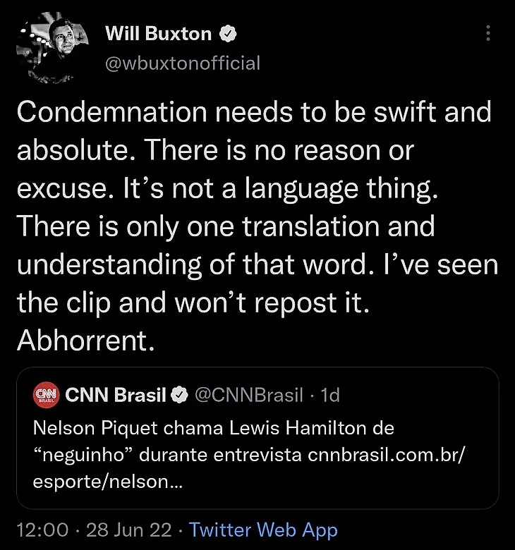 «В Великобритании раскопали в интервью, которое у себя на родине неделю назад дал Пике по поводу прошлогоднего столкновения в «Сильверстоуне». Он плохими словами назвал Льюиса за саму аварию и его реакцию после финиша, но да бог с ними с плохими словами. Самое главное, что он использовал, как они пишут, расистское ругательство на португальском. Ну и все, теперь его начали «отменять». «Мерседес» разразился пресс-релизом, «Формула-1» написала, что поддерживает Льюиса и его борьбу за разнообразие, недопустимо его оскорблять, и.т.д.