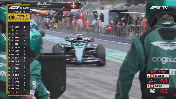 – На 15-м круге двойной пит-стоп «Феррари» (остановки – 4,4 и 4,5 секунды) и «Астон Мартин». Параллельно произошел рестарт – Леклер оказался вторым, Перес – третьим, Хэмилтон – 4-м, Норрис – 5-м, Сайнс – только 6-м, а Алонсо – 7-м! Стролл улетел на 15-е.