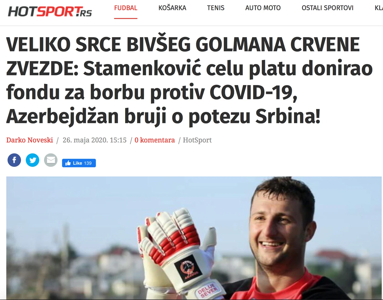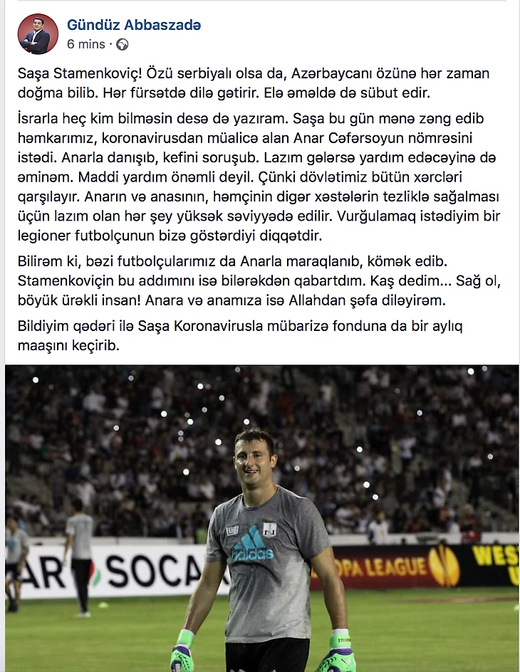 Вот что написал Аббасзаде в своем аккаунте в социальной сети: "Саша Стаменкович - серб, для которого Азербайджан стал родной страной. Саша всегда подчеркивает это не только на словах, но и на деле. Хотя сам Стаменкович настойчиво просил меня не афишировать это, но я все-таки сделаю это. Сербский вратарь позвонил мне сегодня, попросив номер Анара Джафарсоя. Многие знают Джафарсоя, это наш коллега, журналист который заболел коронавирусом. Стаменкович пообщался с Анаром, и я уверен что и он поможет заболевшему журналисту. Финансовая помощь здесь не так важно. Государство и так взяло на себя расходы по лечению Анара и его матери, также болеющей коронавирусом. Знаю, что Джафарсою много кто помог. Но уж точно Стаменкович - единственный иностранный футболист, кто связался с журналистом, высказав желание помочь ему.