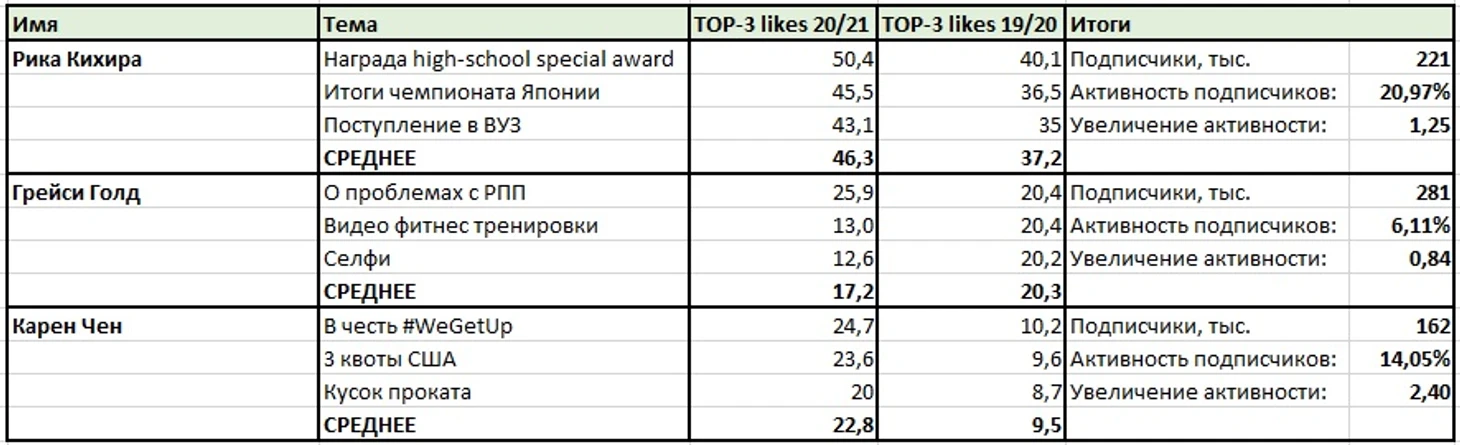Также посмотрим вкратце на самых популярных (по числу подписчиков) иностранных фигуристок и отметим феноменальный прирост активности поклонников Карен Чен. Попадание в сборную на ЧМ, КЧМ и возврат американкам трех квот, безусловно, был главным событием в США и сделал Чен героиней сезона. Рика Кихира, несмотря на падение спортивных результатов, продолжает прибавлять в популярности. А вот инстаграм Грейси Голд, несмотря на ее выступление на чемпионате США в этом сезоне, имеет все внешние признаки давно едущей с ярмарки фигуристки, как и у Жени с Алиной – коэффициент активности ниже 1 и снизившееся количество лайков, как и общее соотношение лайков к подписчикам.