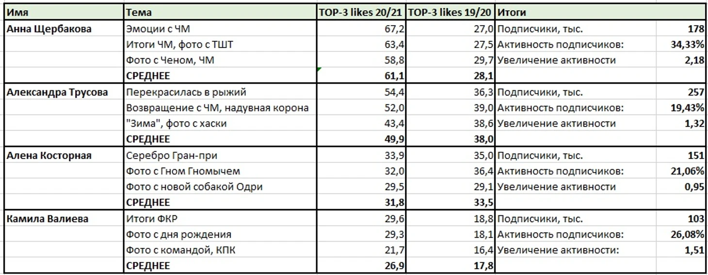 В сравнении ТЩК и стремительно рвущейся к ним Камилы видим, что несмотря на общее лидерство по подписчикам Саши, самая активная аудитория у Ани, которая к тому больше всех прибавила в активности за этот сезон. Парадоксально, но факт – ушедшие за популярностью, хайпом и спонсорами Саша и Алена выиграли куда меньше, чем не гонявшаяся за славой Анюта (я уже не говорю о количестве эфиров на Первом, где Щербакова, пожалуй, побила рекорд по частоте появления фигуристки в эфире за сезон и среди ведущих Первого уже считается практически коллегой благодаря своим эфирам с КЧМ). Вдвойне должно быть грустно для Трусовой и Косторной, что максимальный хайп в инстаграме Ани вызывают исключительно ее спортивные достижения, а не рыжие волосы и фото с Гном Гномычем.