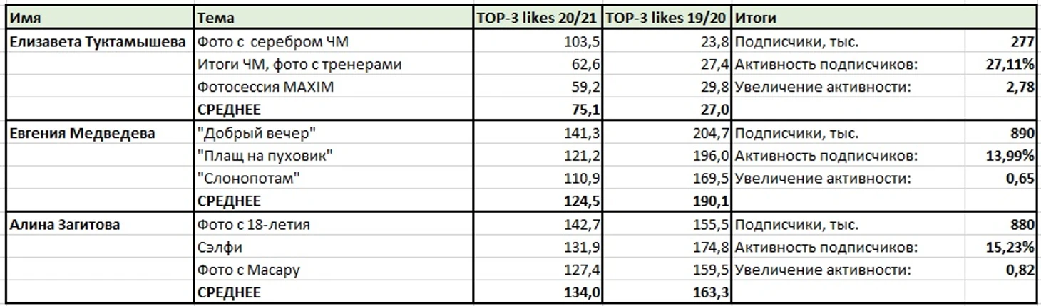Как видим из таблицы, больше всего подписчиков у Жени Медведевой. Но насколько они активны в сравнении, например, с подписчиками Алины Загитовой и Лизы Туктамышевой? Растет или падает их активность из года в год? Ответы на этот вопрос нам даст таблица активности подписчиков. В ней мы сравним среднее количество лайков по трем самым популярным постам в этом и прошлом сезоне. Коэффициент увеличения активности, рассчитанный как отношение среднего ТОП-3 лайков этого сезона к прошлому, показывает, насколько аудитория аккаунта прибавила (если >1,0) или сбавила активность в инстаграме фигуристки. Активность подписчиков рассчитывается как соотношение среднего ТОП-3 лайков к общему числу подписчиков, в процентах. Чем выше процент, тем более аудитория активна и тем чаще лайкает посты.