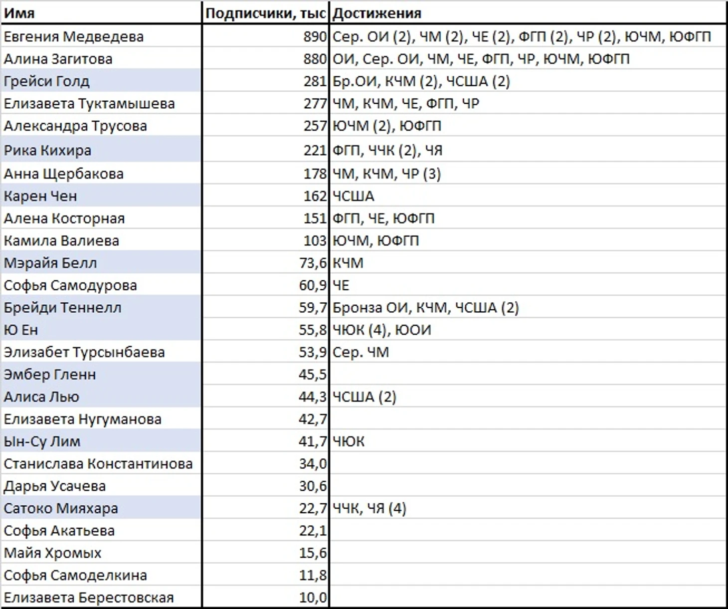 Итак, для ответа на первый вопрос представляю таблицу номинально действующих фигуристок сезона 20/21 (Алину на паузе и пропустившую сезон Женю причисляем к действующим фигуристам, особенно на фоне обсуждения о включении их в сборную 21/22). Сразу отвечу на возможные вопросы – включил наших юниорок и новисов, потому что они задают тренды мирового ФК и вам наверняка будет интересно следить за ними в будущем, в таблице не все известные иностранные фигуристки (простите, поклонники Маэ-Беренис Мейте, Луны Хендрикс, Стар Эндрюс и др.). У Каори Сакамото, похоже, нет инстаграма (если найдете, киньте ссылку в комментариях), поэтому ее тут тоже нет.