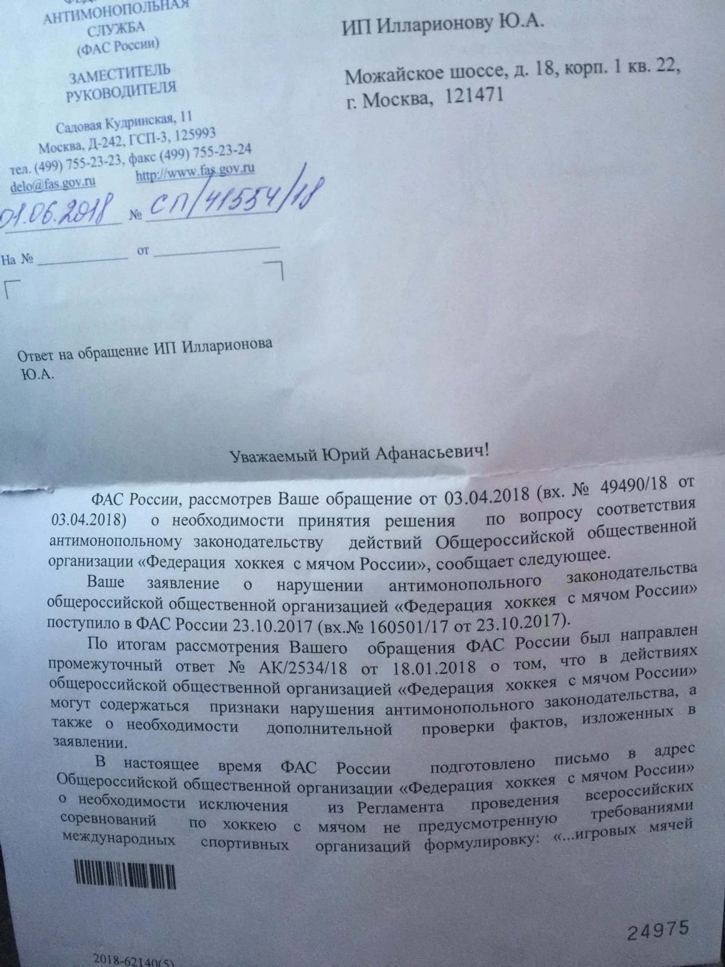 Однако, до сих пор от чинуш ФХМР так и не последовало никакой реакции, а ведь до начала соревнований Кубка России осталось всего два месяца По словам Илларионова для ускорения решения он был вынужден обратится в ФАС повторно уже на то, что ФХМР задерживает реализацию указаний этого государственного ведомства.