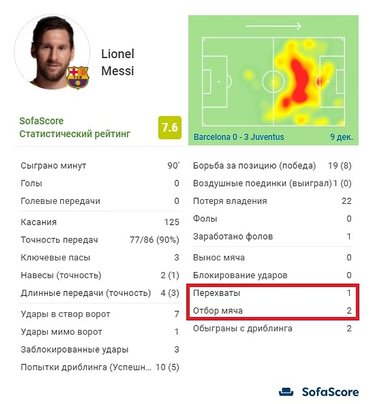 Открываем статистику аргентинца в том поединке и видим, что даже в таком неудачном матче Лео сумел совершить 1 перехват и 2 отбора.
