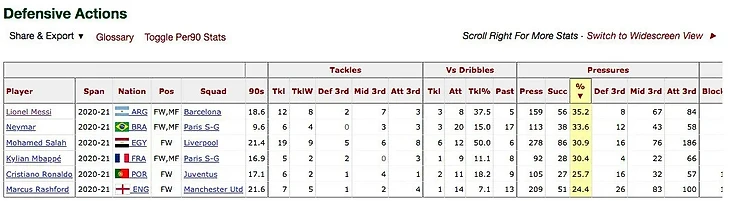 В сезоне 2020/21 капитан "Барселоны" совершил 159 попыток прессинга. Это третий показатель в Европе после Салаха(278) и Рэшфорда(209). При этом прессинг Месси наиболее эффективен среди всех нападающих - 35.2%
