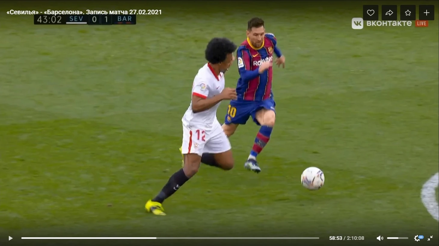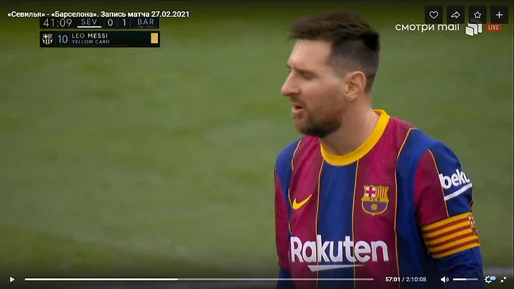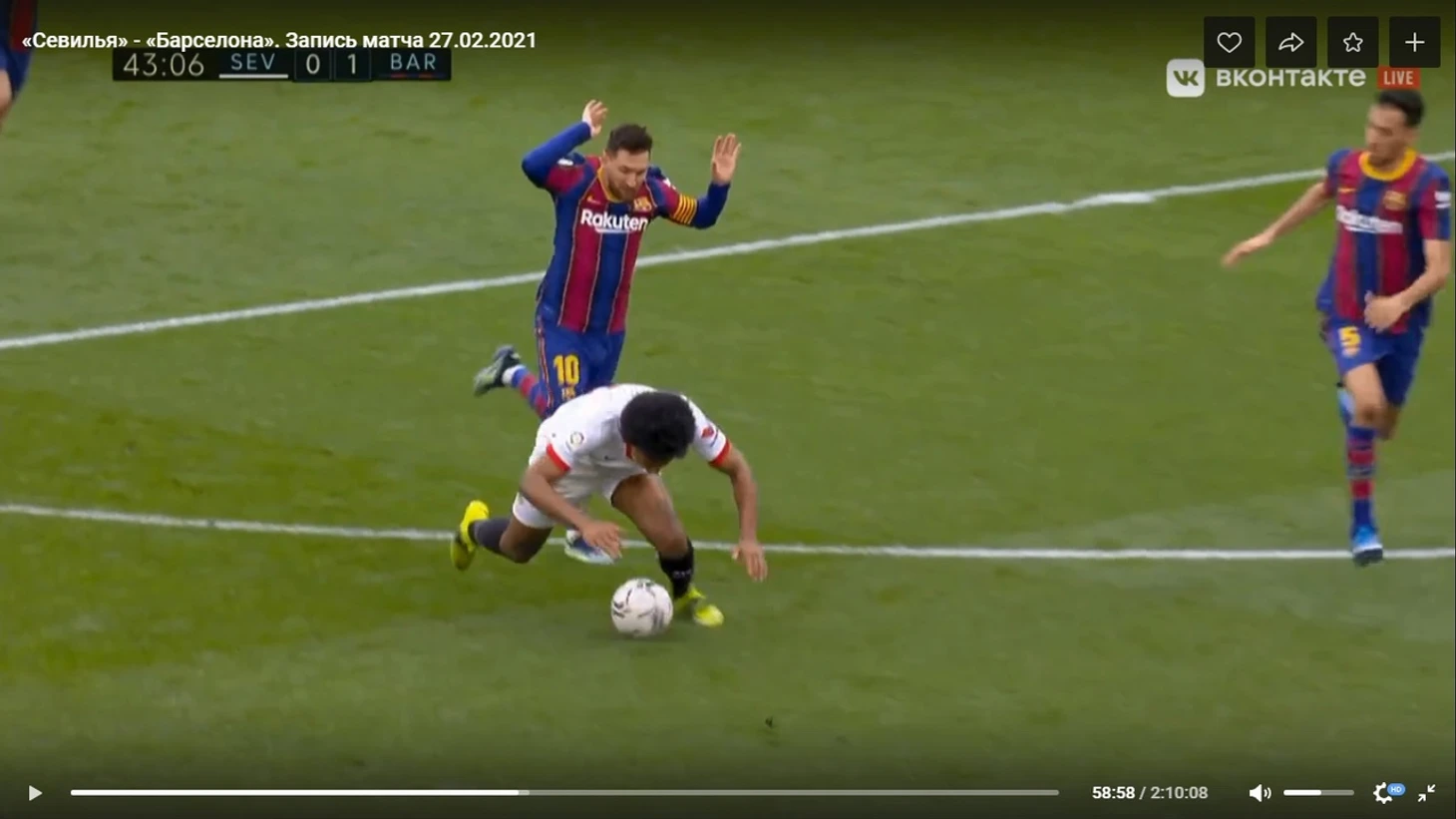 Буквально минуту спустя Месси совершает рывок из линии атаки к центральному кругу и с нарушением правил срывает опасную атаку "Севильи".
