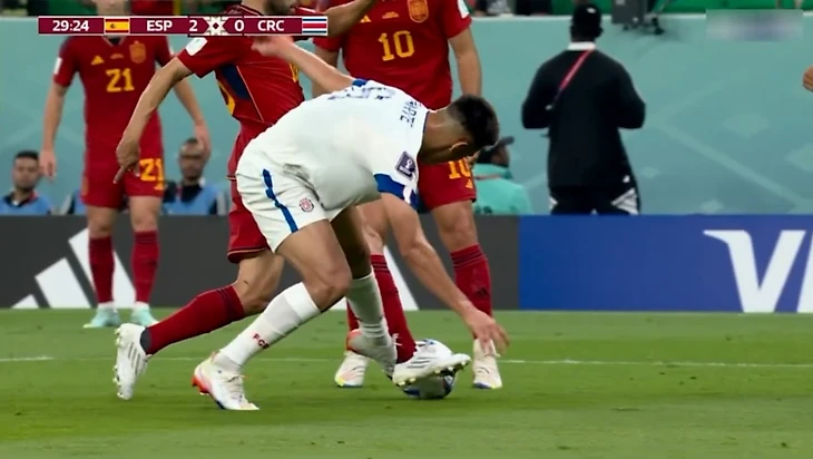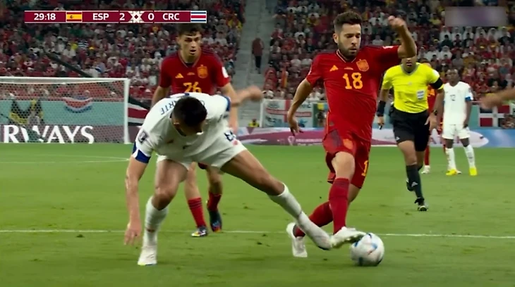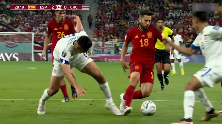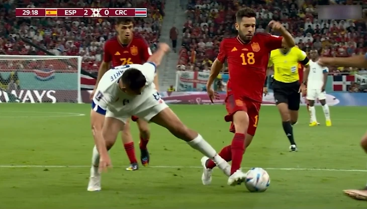Третий гол был полностью организован каталонцами. Испанцы закрутили невероятно долгий розыгрыш в недалеко от штрафной, измотав соперников в ходе перепасовки. В итоге Альба взял мяч на себя и начал тащить его к воротам. Но защитник Коста-Рики Оскар Дуарте пнул Жорди по голеностопу сзади.
