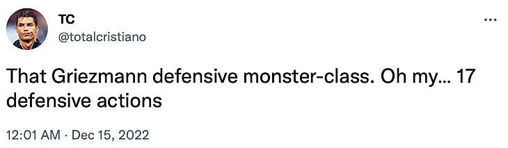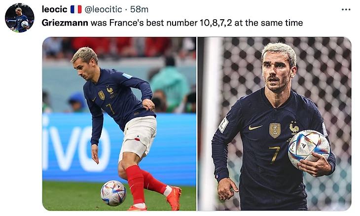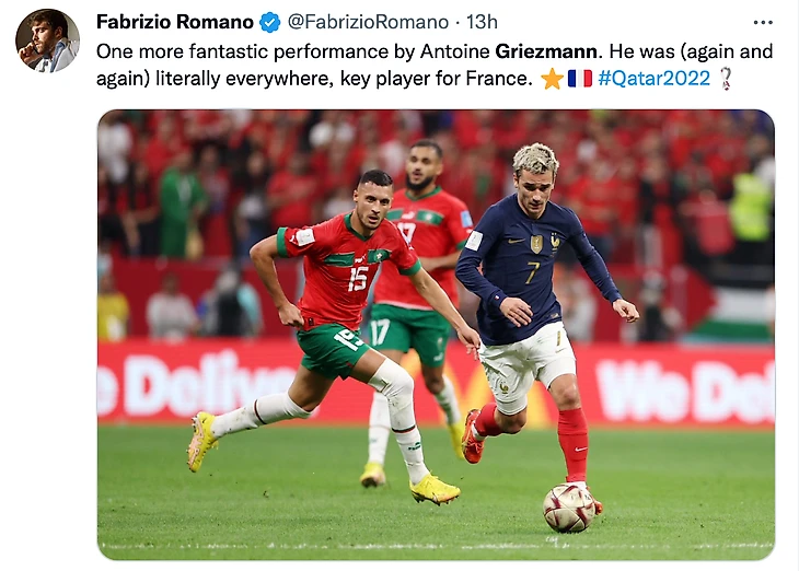 «Еще один фантастический матч Гризманна. Он был (снова и снова) по-настоящему вездесущ, ключевой игрок для Франции».