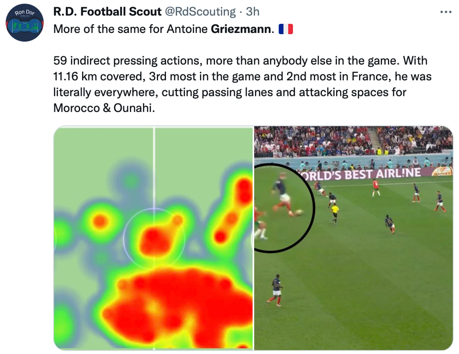 59 действий в контрпрессинге, больше, чем кто-либо другой в матче. Пробег в 11,16 км - 3-й в игре и 2-й среди французов. Он был буквально везде, срезая линии для передач и захватывая пространство Марокко, а в частности, Унаи».