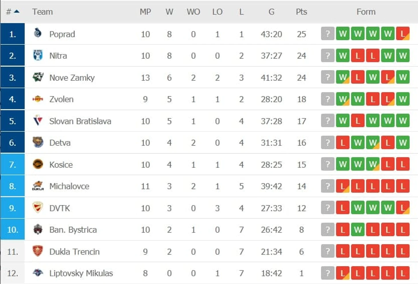 После двух пропущенных матчей подряд на лед вернулся "Липтовски-Микулаш": ещё одна неявка привела бы к автоматическому исключению клуба из лиги. Команда до 57-й минуты вела в Зволене со счетом 2:0, но в самом конце матча пропустила два гола, а затем проиграла в серии буллитов. Набранное клубом очко стало для него первым с начала сезона: после восьми игр у команды восемь поражений с общей разницей 18:42.