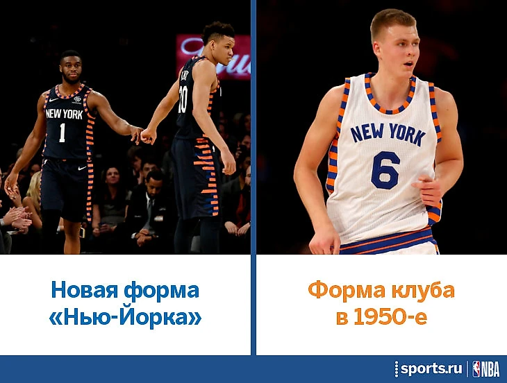 «Никс» порылись даже в дедушкином – их новая форма навеяна майками из 1950-х. И нет, Кристапс Порзингис не играл за «Никс» в 1950-е, просто клуб уже много сезонов надевает эту ретро-форму на пару игр в году. В текущей вариации (настолько темно-синей, что почти черной) цветные полоски разной ширины символизируют небоскребы Нью-Йорка.
