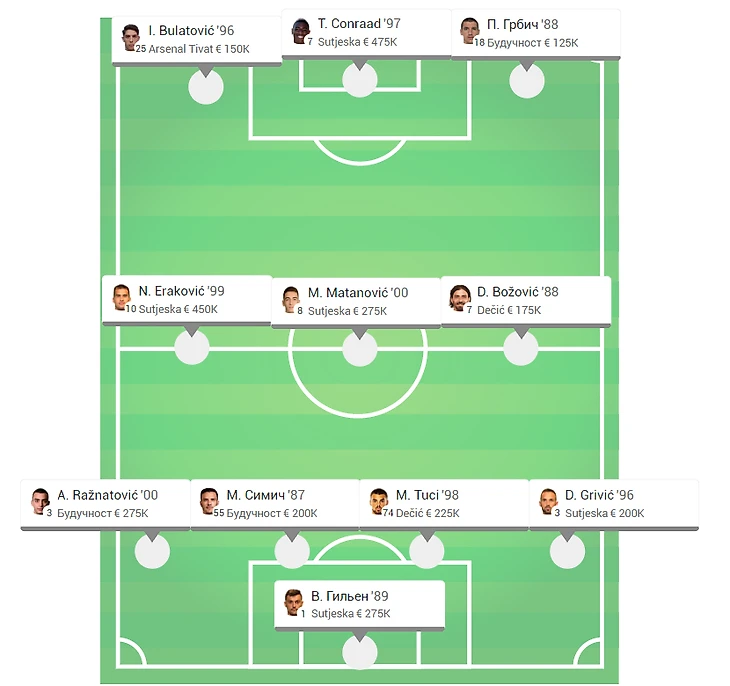 Место среди лучших заняли вратарь Владан Гильен (Сутьеска), правый защитник Драган Гривич (Сутьеска), левый защитник Андрия Ражнатович (Будучност), стопперы Марко Симич (Будучност), Марко Тучи (Дечич) и Владан Аджич (Будучност), полузащитники Марко Матанович (Сутьеска), Новица Эракович (Сутьеска) и Драшко Божович (Дечич) и нападающие: Иван Булатович (Арсенал), Петар Грбич (Будучность) и Тайрон Конрад (Сутьеска).
