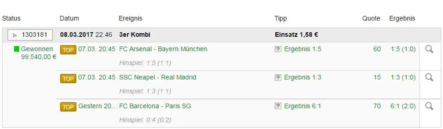 Кто-то пошел еще дальше – и зарядил 1,58 евро на три счета. В итоге «Бавария» грохнула «Арсенал» 5:1, «Реал» победил «Наполи» 3:1, а «Барселона» выиграла 6:1 у «ПСЖ». А 55-летний болельщик из Германии забрал 99 540 евро, потому что угадал со всеми тремя счетами. Поразительно!