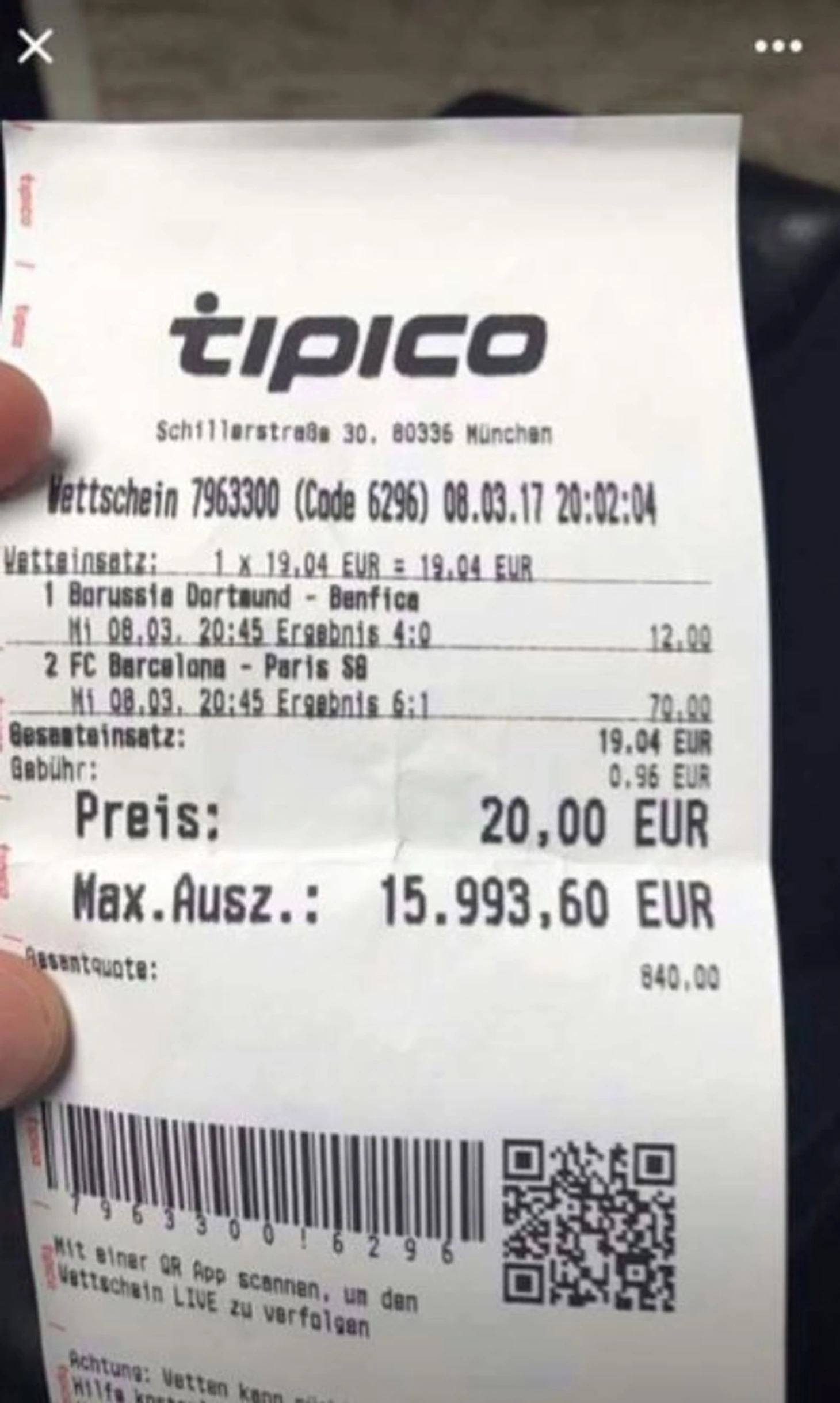Например, один из ставочников потратил 20 евро, чтобы просто указать счет двух ответных матчей 1/8 ЛЧ, которые проходили в один и тот же день. Поставил на победу «Боруссию» над «Бенфикой» 4:0 и – да-да – безумные 6:1 «Барселоны» над «ПСЖ».
