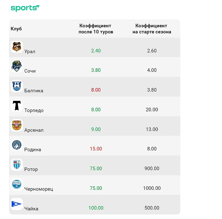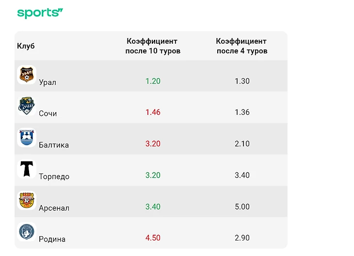 «Балтика» после неяркого начала обзавелась коэффициентом выше, вырос он почти в два раза и на «Родину». Лидерство «Арсенала» уменьшило значение до 9.00, но пока это все равно лишь пятый показатель. А два главных претендента – «Урал» и «Сочи».
